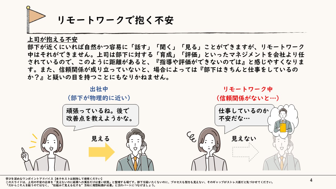 リモートワークが普及し、対面でのコミュニケーションが減少する中で、多くの管理職がマネジメントへの不安を抱えています。しかし、顔が見えないことで生じる「評価や進捗への不安」は部下も同様であり、今求められているのは、物理的な管理に頼らないオンライン時代に適した新しいマネジメントの形です。