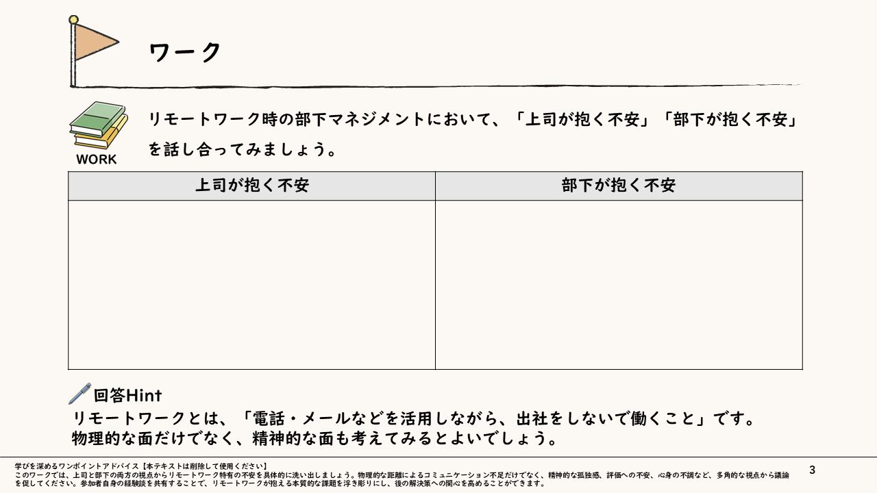 【ねらい】オンライン環境下で部下の自律を促し、チームの成果を最大化させる手法を習得する。