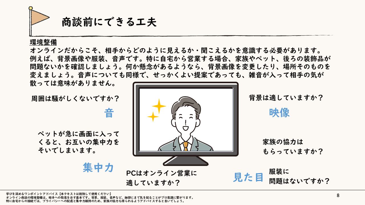 事前準備のポイントから、視覚資料の効果的な提示方法、画面越しでも熱量を伝えるコミュニケーション術まで、「画面越しでも信頼を勝ち取る」ための具体的なアクションを伝授します。新たな時代の営業スタイルをいち早く自分のものにし、場所を選ばず着実な成果をつかみ取るプロフェッショナルを目指します。