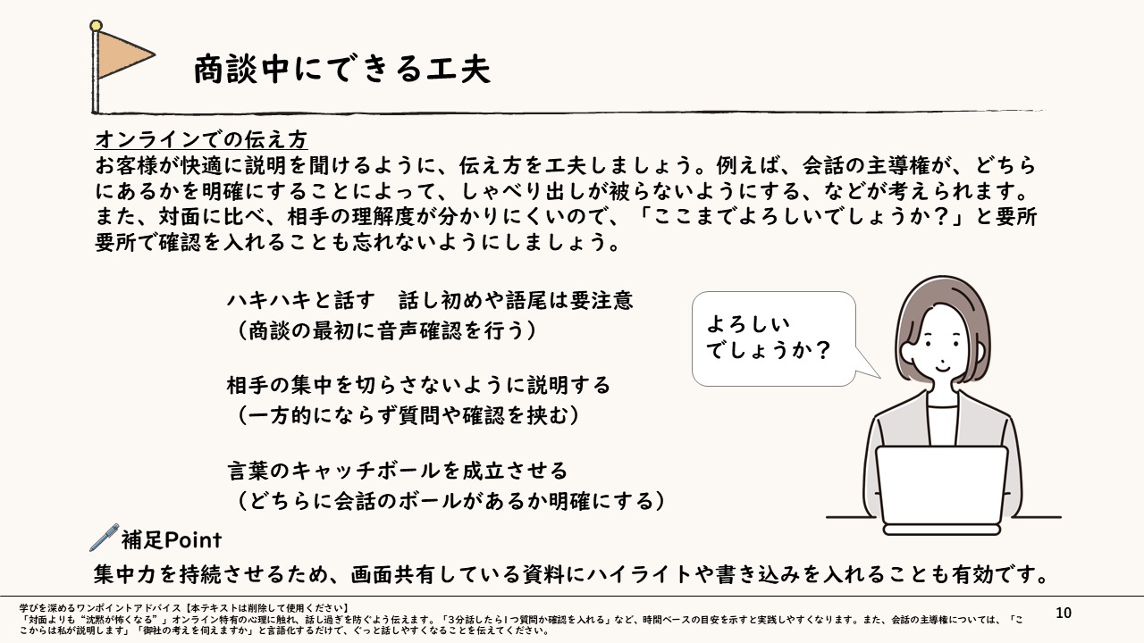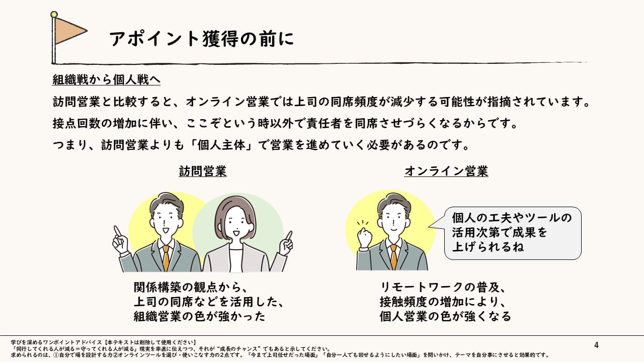 ・従来の対面営業の強みを活かしつつ、オンライン特有のノウハウを体系的に教えたい研修講師の方