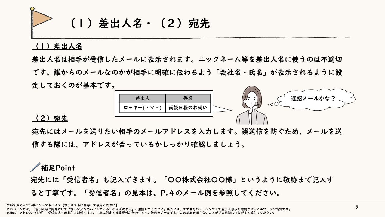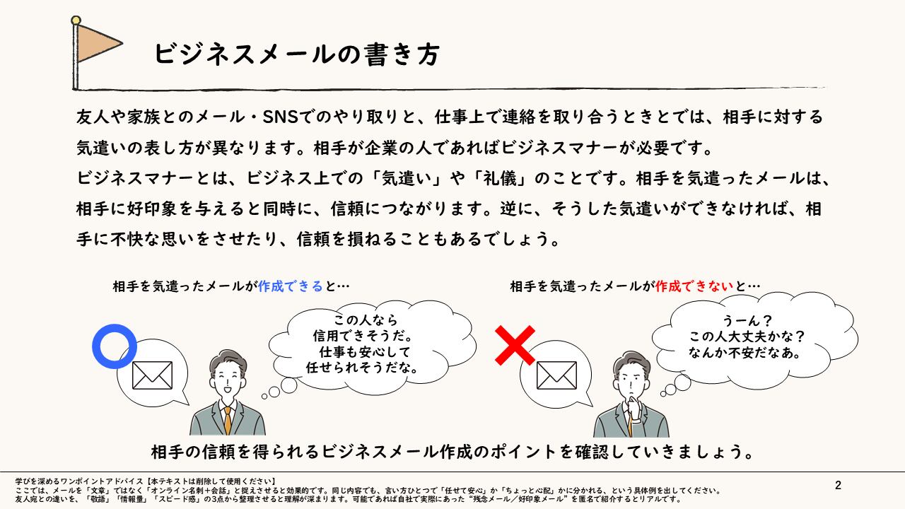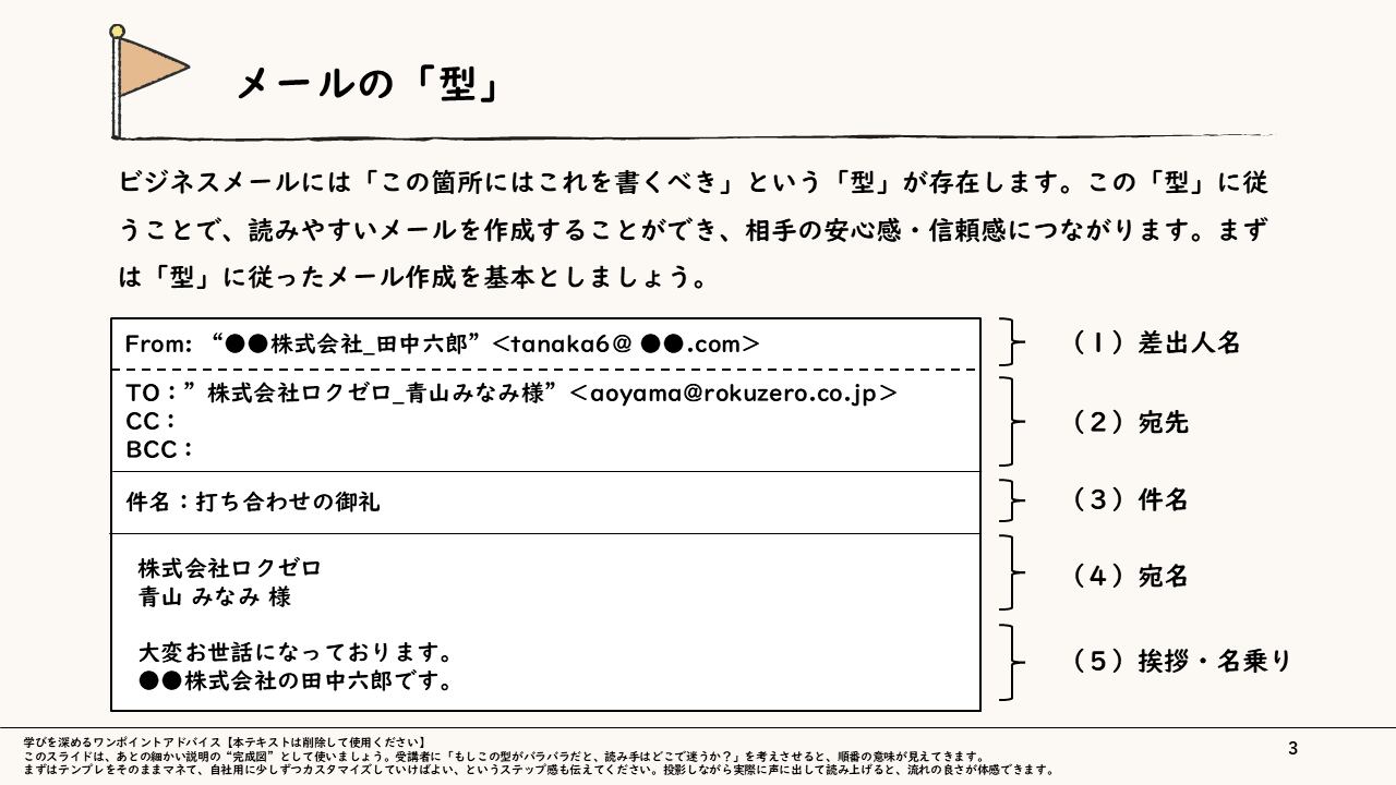 【ねらい】正確かつ好印象なメール作成術を学び、円滑に業務を推進するスキルを習得する。