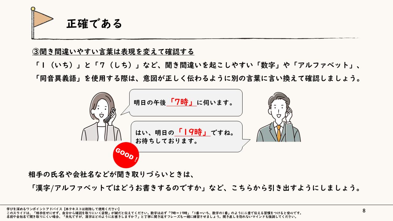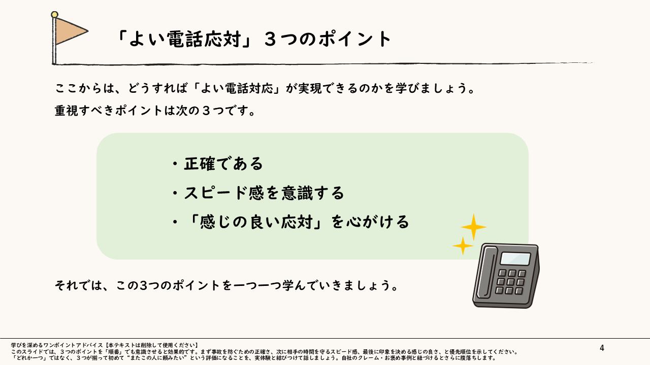 本スライドでは、質の高い電話応対を実現するための3原則として「正確さ」「スピード感」「好感の持てる応対」を軸に、実践的な所作を学習します。具体的には「3コール以内に出る」といった基本動作から、相手の発言を妨げない傾聴の姿勢まで、細かな配慮のポイントを体系的に整理します。