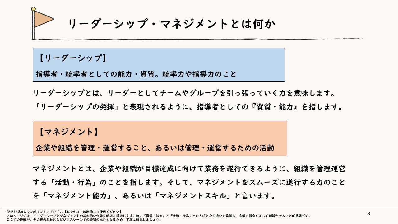 リーダーシップやマネジメントは、管理職だけのスキルではありません。むしろ、仕事の質とスピードが求められる若手社員こそ、早期に身につけるべき必須スキルです。 本スライドでは、周囲の協力を得て仕事を進めるための「リーダーシップ」や、自身のモチベーションを管理し周囲と良好な関係を築く「マネジメント」の本質を解説します。「自分にはまだ早い」という固定観念を払い、身近な範囲から組織効率を高めるための具体的な行動イメージを醸成。60分の短時間で、若手のうちから意識すべき「人を動かし、自分を整える力」の鍛え方を習得することを目指します。