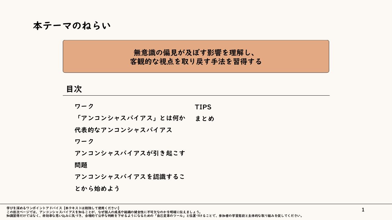 【ねらい】無意識の偏見が及ぼす影響を理解し、客観的な視点を取り戻す手法を習得する。