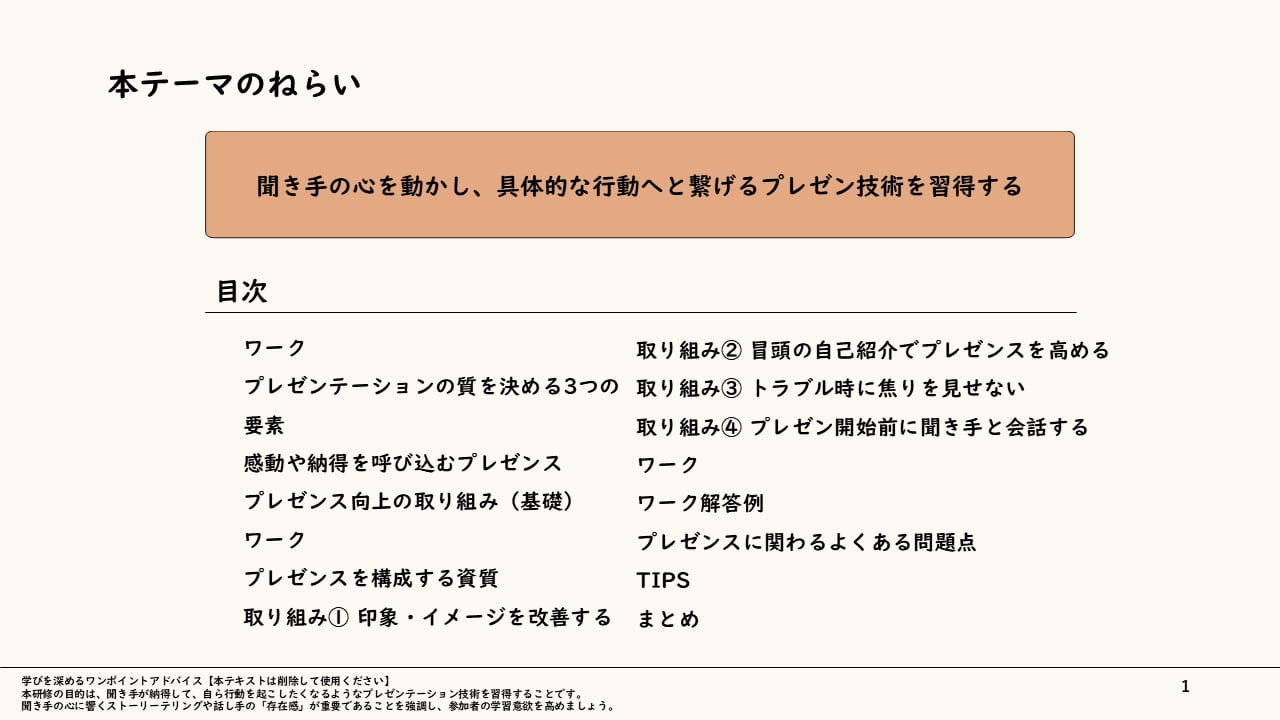本スライドでは、聞き手を惹きつけ、深い納得感と共感を生み出すための構成の極意から、熱量を伝える非言語スキル(デリバリー)までを体系的に解説します。「自信を持って話したい」「プレゼンを成果に直結させたい」という受講者の切実なニーズに応え、一方向的な「説明」を、双方向的な「合意形成」の場へと変える手法を伝授します。