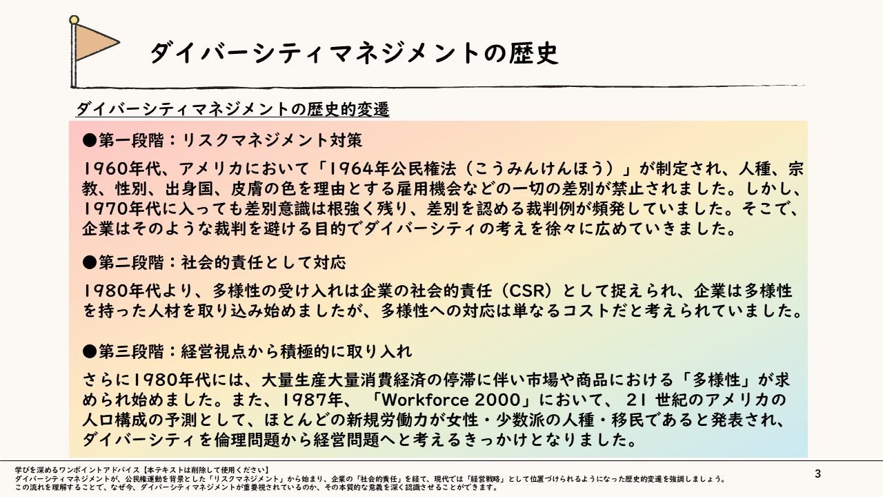 人材の多様性が高まる現代において、価値観の違いを「摩擦」で終わらせず、組織の「強み」へと転換するためのマネジメント手法を習得するスライドです。 ダイバーシティマネジメントの本質は、単に多様な人材を集めることではなく、その違いを戦略的に組織の変革や競争力へ活かすことにあります。一人ひとりの個性や価値観が最大限に発揮される環境・制度の整え方から、個々のパフォーマンスを最大化させる関わり方までを解説。多様性を「活力」に変え、組織全体の力を大きく向上させるための視点と実践スキルを身につけることを目指します。