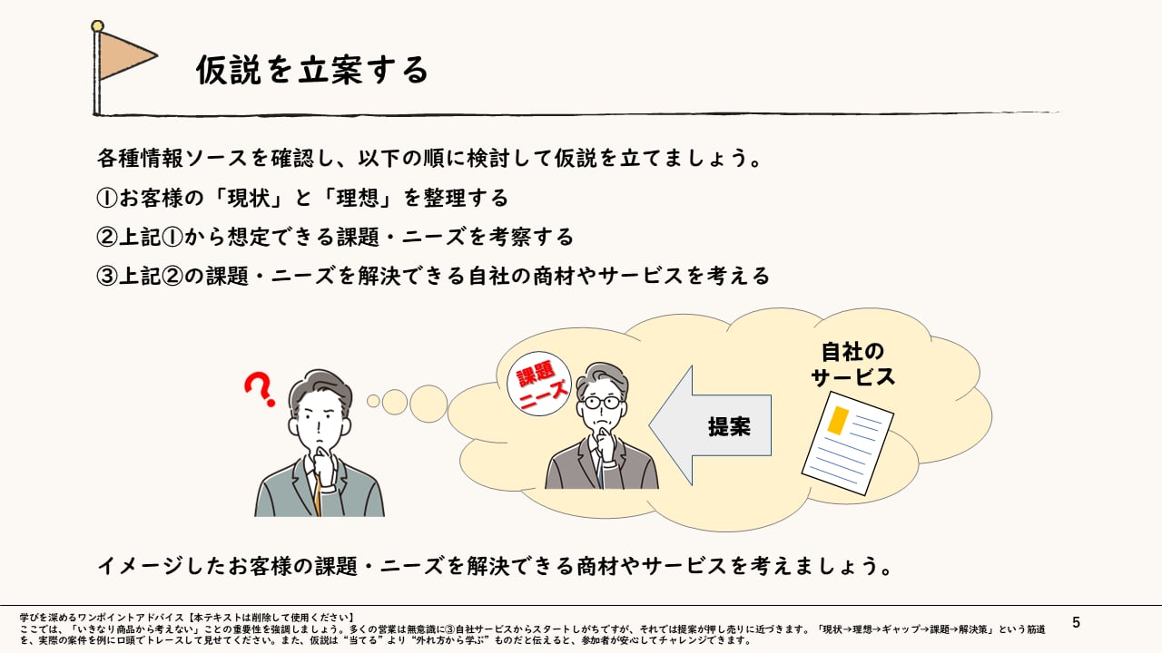 仮説を持って商談に臨むことで、顧客に「自社のことをよく理解してくれている」という安心感を与え、無駄なやり取りを排除した最短距離での成約が可能になります。場当たり的な対応から脱却し、確度の高い提案を連発するための「質の高い営業活動」の展開を目指します。