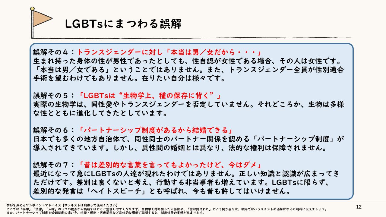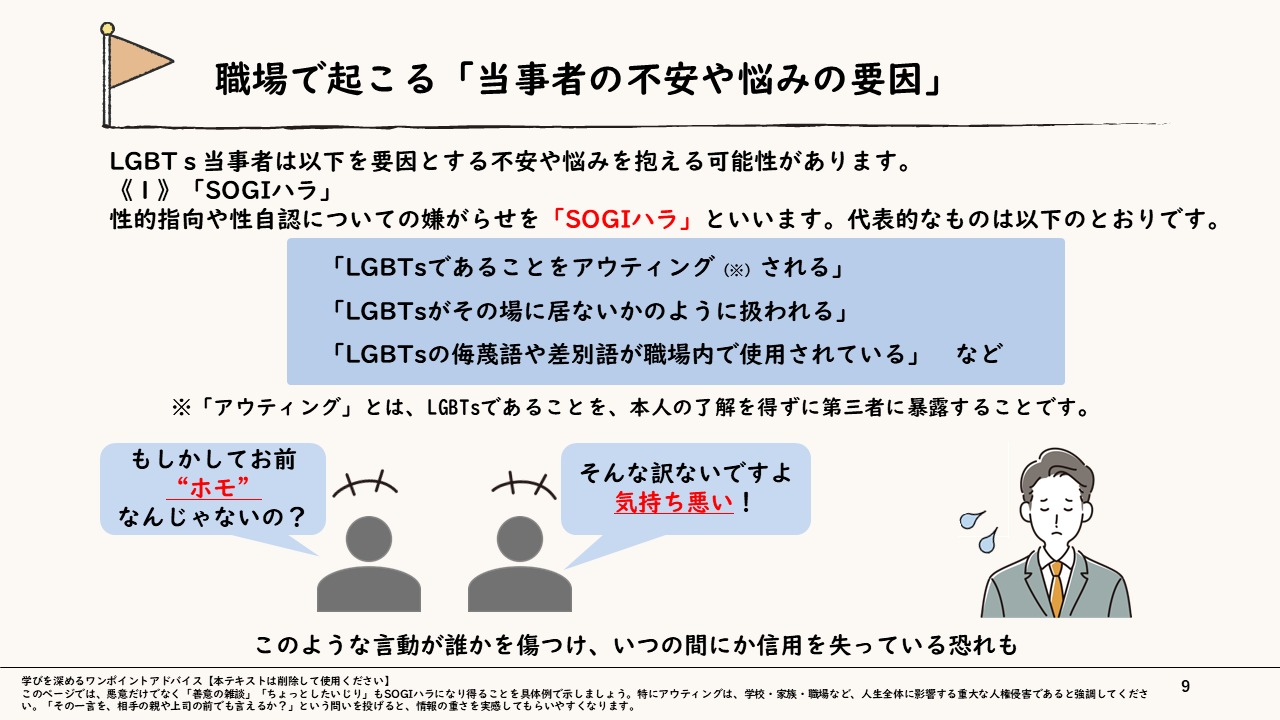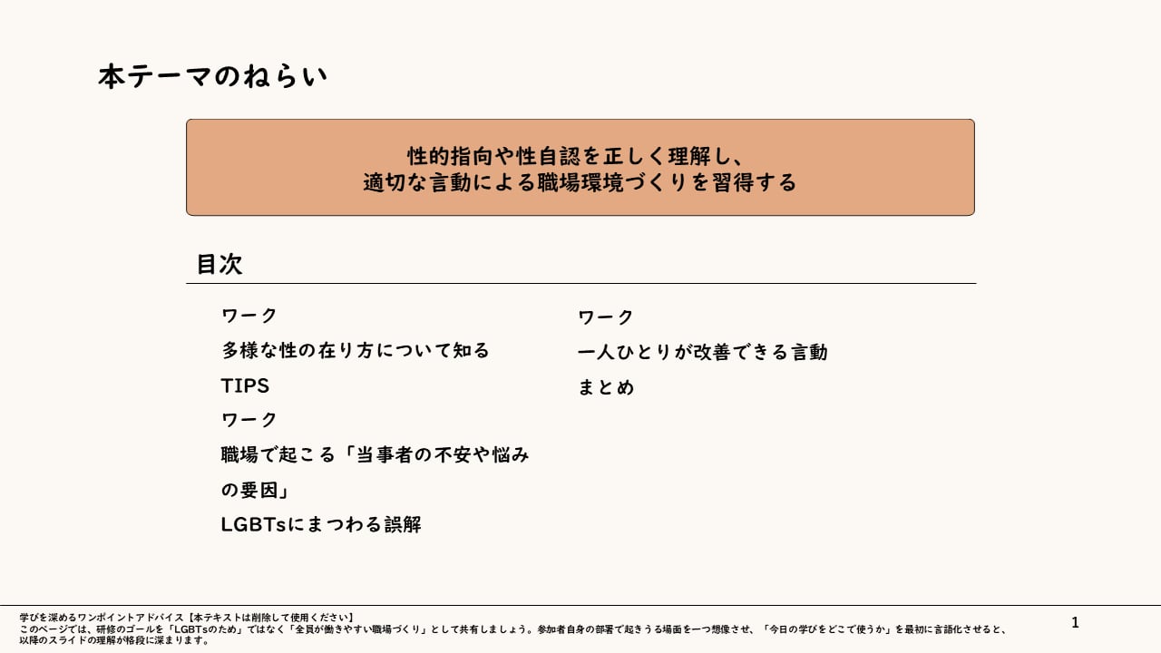 【ねらい】性的指向や性自認を正しく理解し、適切な言動による職場環境づくりを習得する。