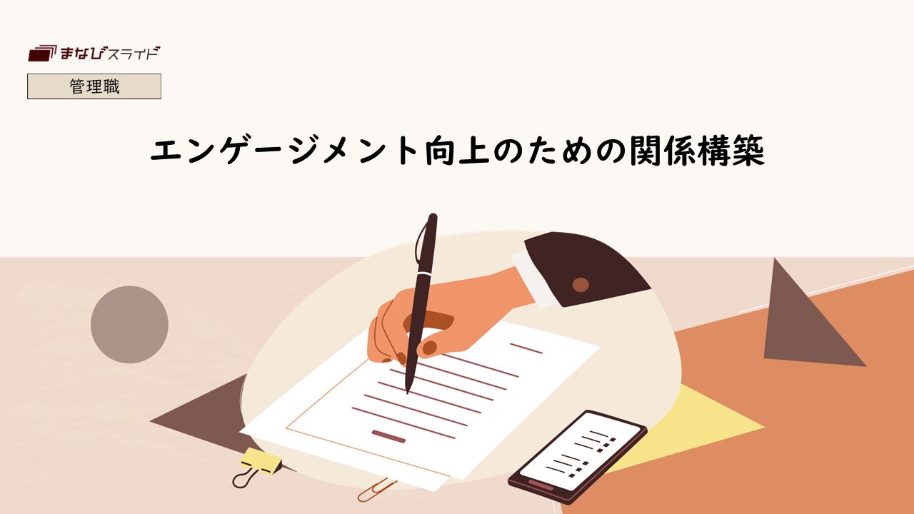 本スライドでは、エンゲージメントを高めるための土台となる「関係構築」に焦点を当て、具体的なマネジメント手法を体系的に解説します。「自ら部下に話しかける」「感情に共感する」といったコミュニケーションの基本から、「マイクロマネジメントを排した権限委譲」や「チーム内での良好な人間関係の支援」まで、部下の自律を促すためのステップを学びます。