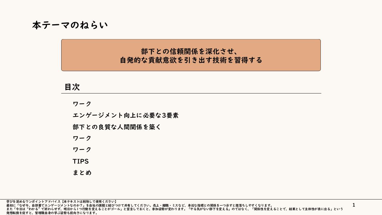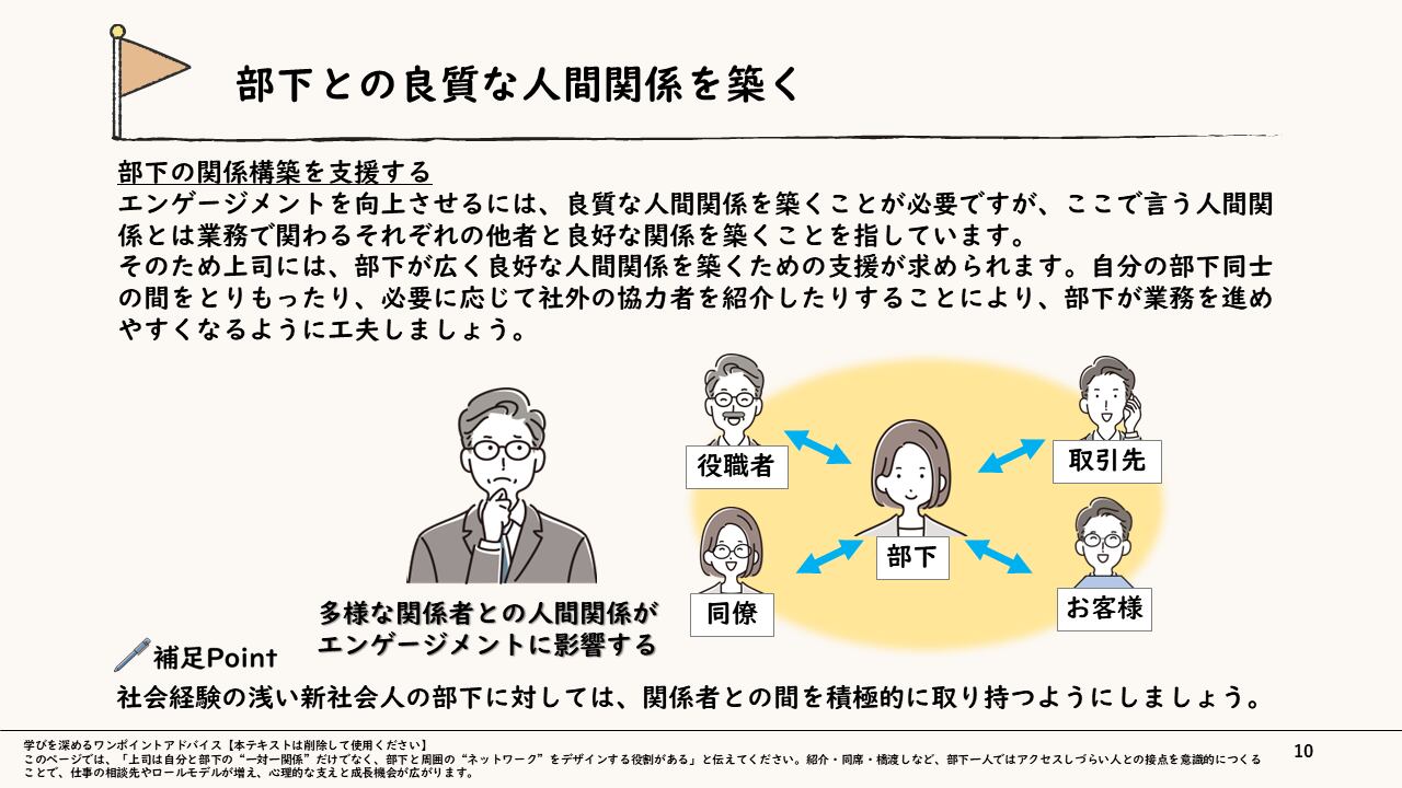 【ねらい】部下との信頼関係を深化させ、自発的な貢献意欲を引き出す技術を習得する。