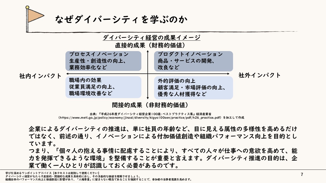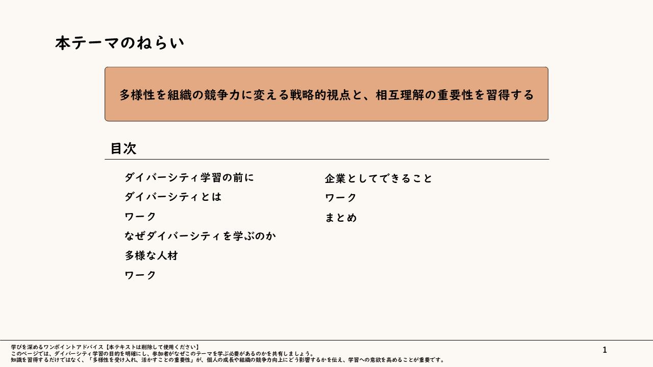 【ねらい】多様性を組織の競争力に変える戦略的視点と、相互理解の重要性を習得する。