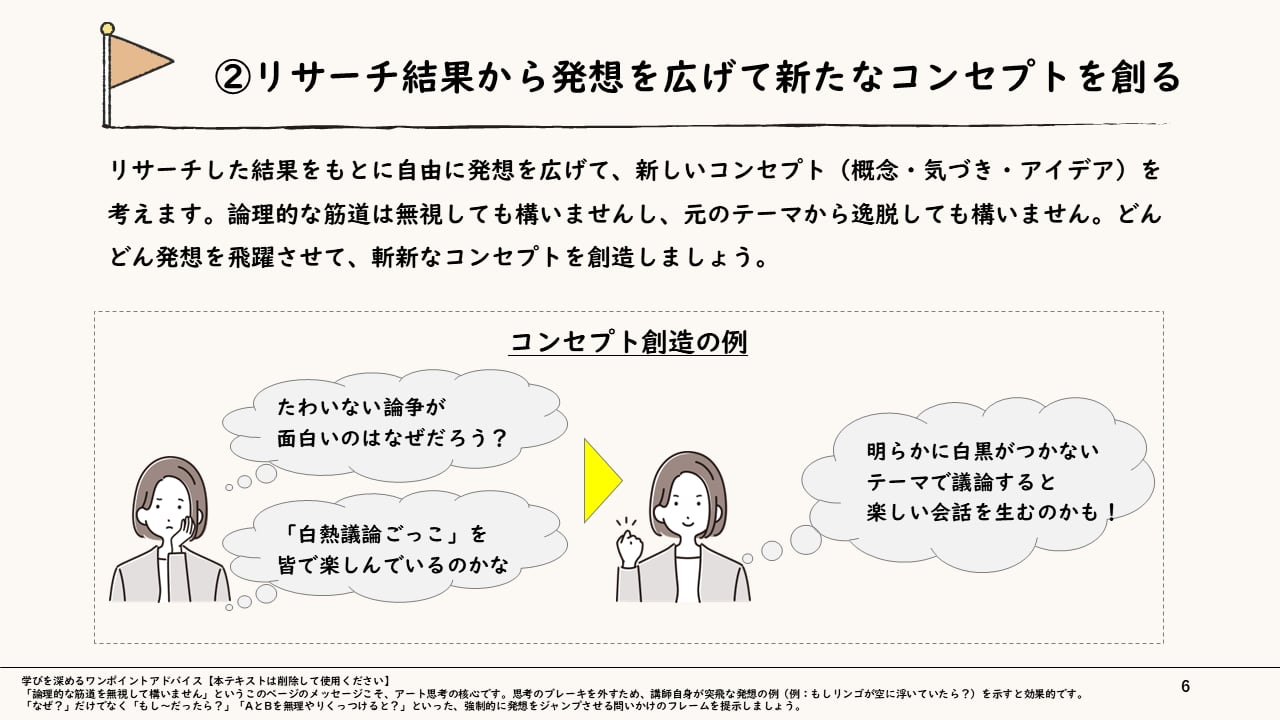 【ねらい】自分自身の感性や問いを起点に、独創的な価値を創り出す思考プロセスを習得する。
