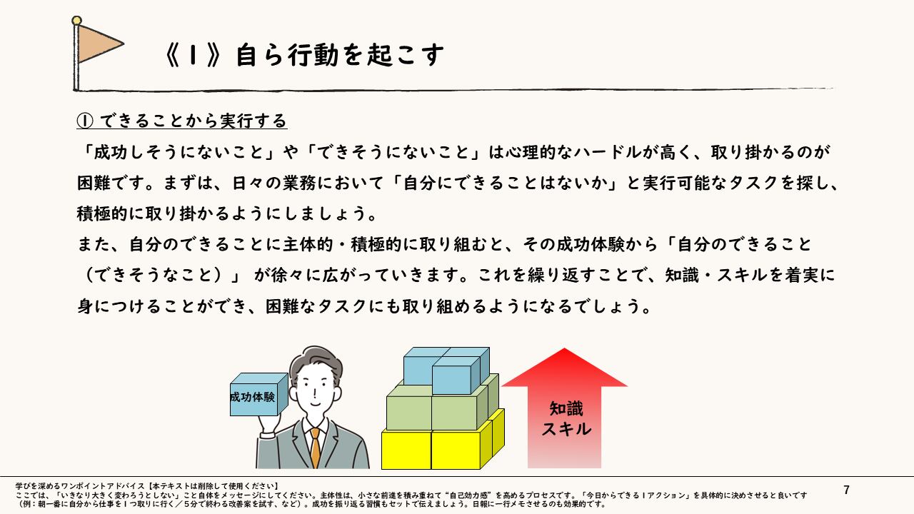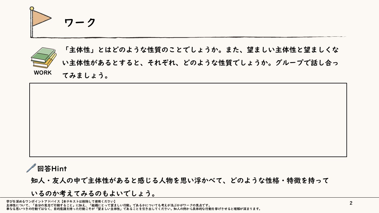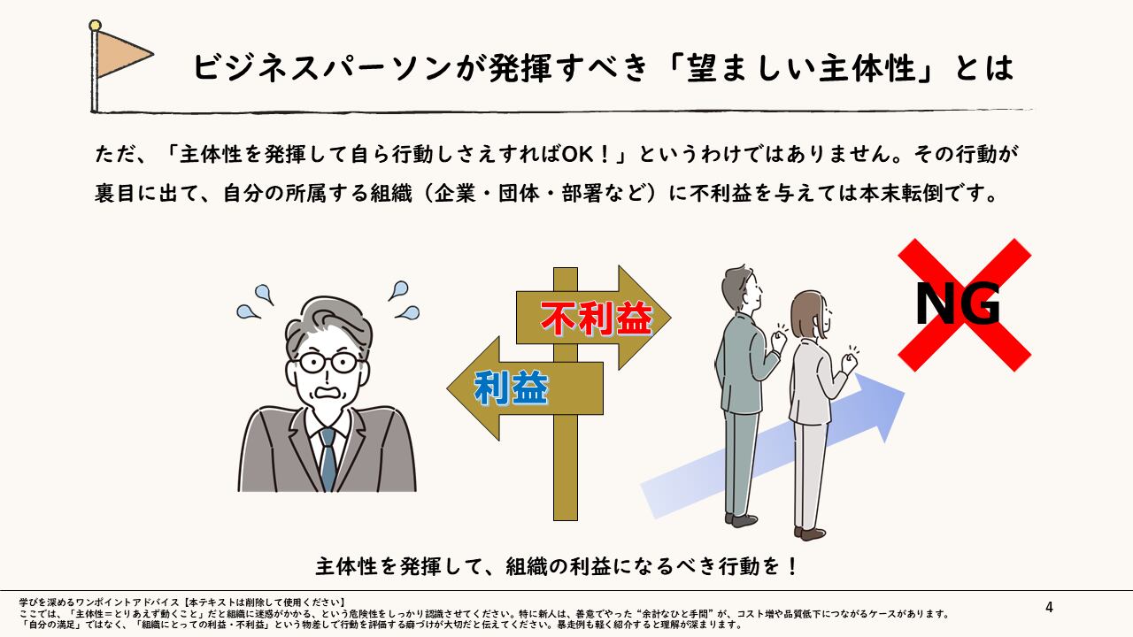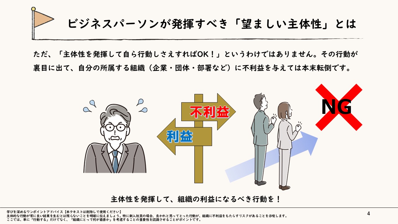 【ねらい】組織の目標を理解した上で自ら考え、適切にアクションを起こす「質の高い主体性」を習得する。