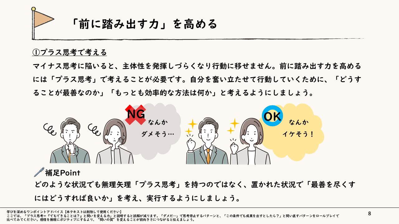 本スライドでは、【前に踏み出す力】【考え抜く力】【チームで働く力】という3つのコア能力をベースに、それぞれを「どのような場面で、どう具体的に活かすべきか」を体系的に解説します。知識を単なる「宝の持ち腐れ」にせず、変化する状況下で自ら課題を見つけ、周囲を巻き込みながら自律的に仕事を動かしていくための思考と行動の型を学びます。