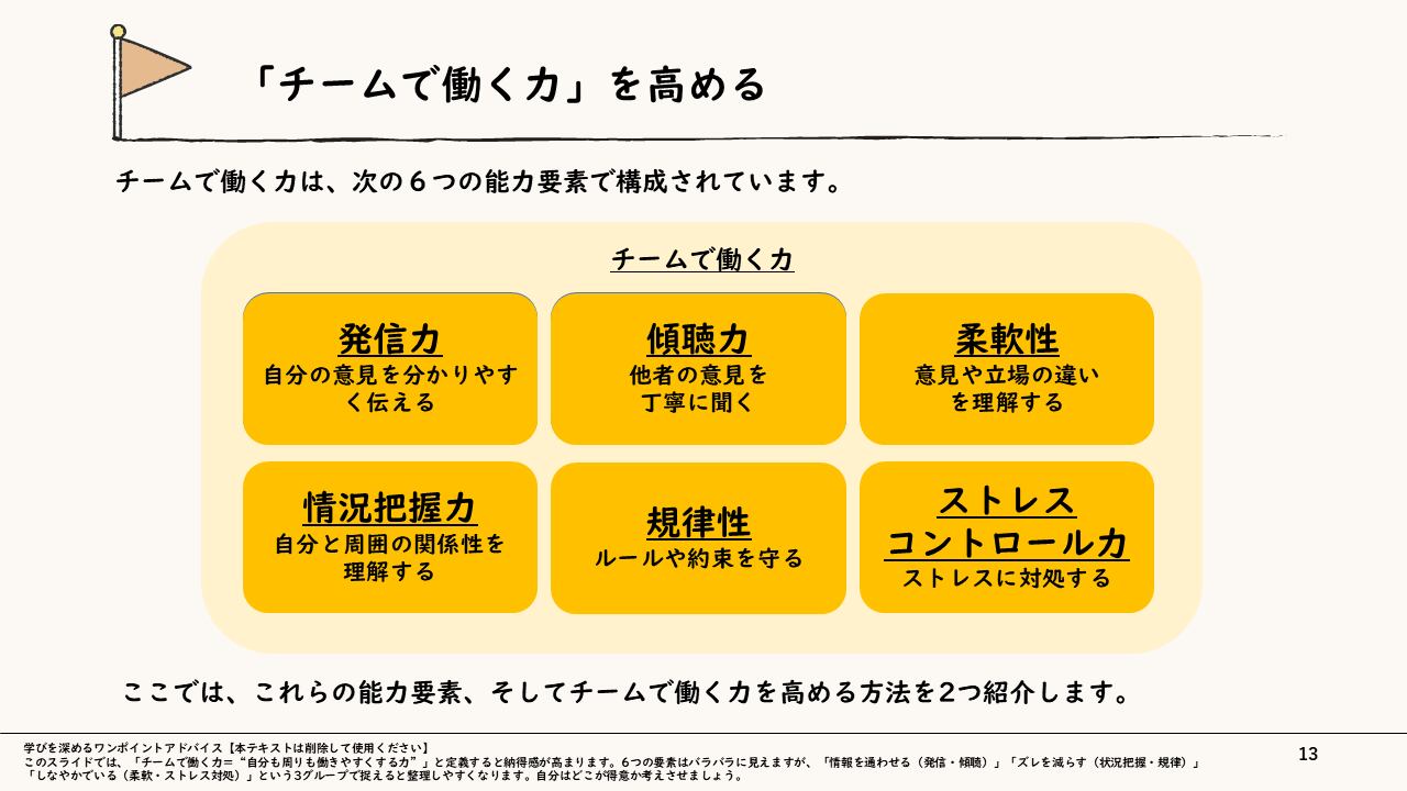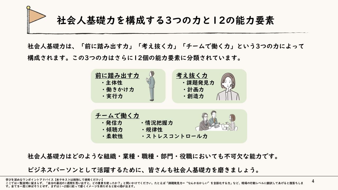 【ねらい】社会人基礎力を構成する「3つの能力」を理解し、実務で成果に直結させる手法を習得する。