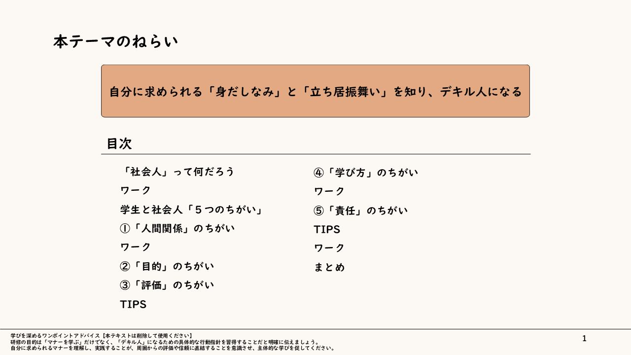 新人のうちからプロとしての「型」を身につけることで、周囲から一目置かれるビジネスパーソンへの成長を後押しし、あらゆる現場で自信を持ってパフォーマンスを発揮できる状態を築くことを目指します。