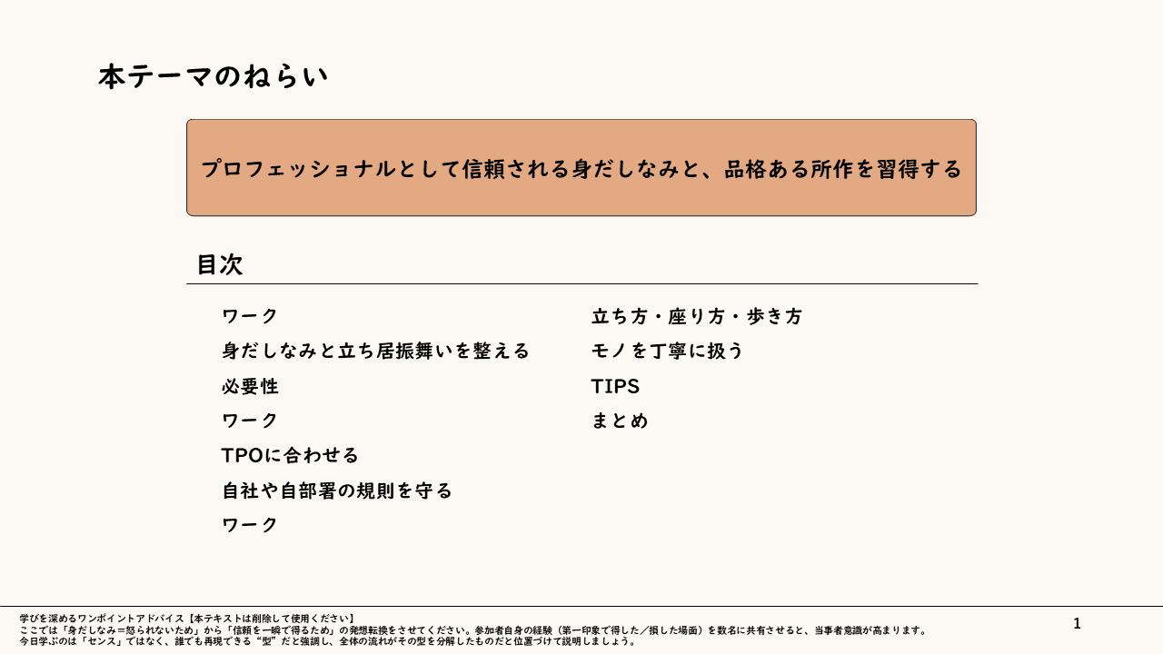 【第一印象で圧倒的な安心感を創る】プロの品格をまとう「外見と所作」の実践研修スライド 〜相手の期待に応える「見た目」と「振る舞い」を型化し、信頼関係の質を変える〜
