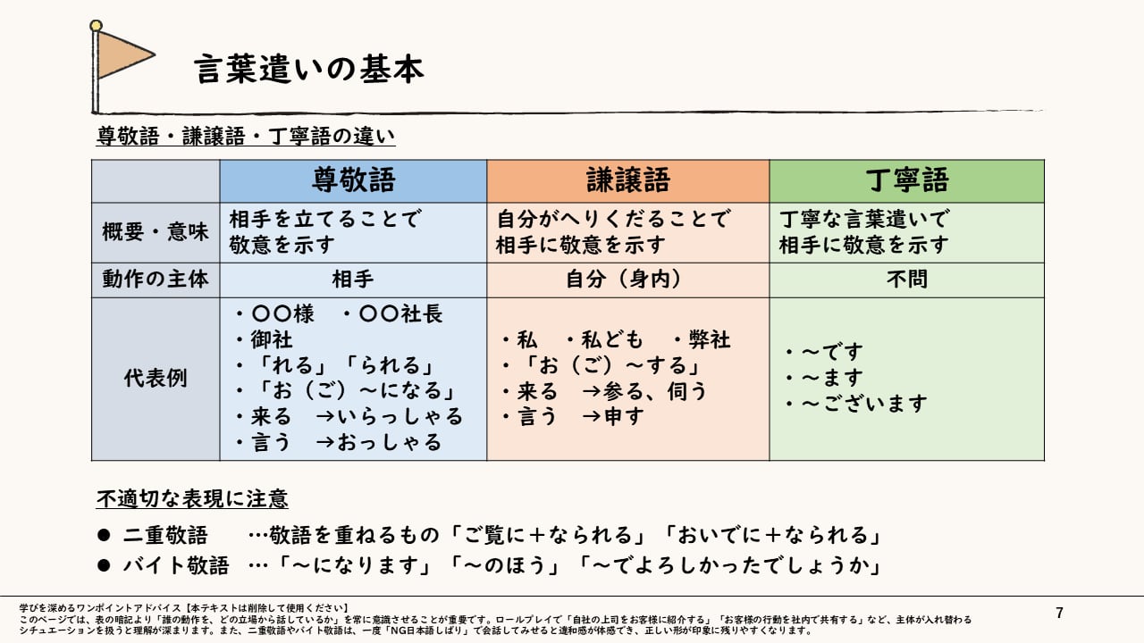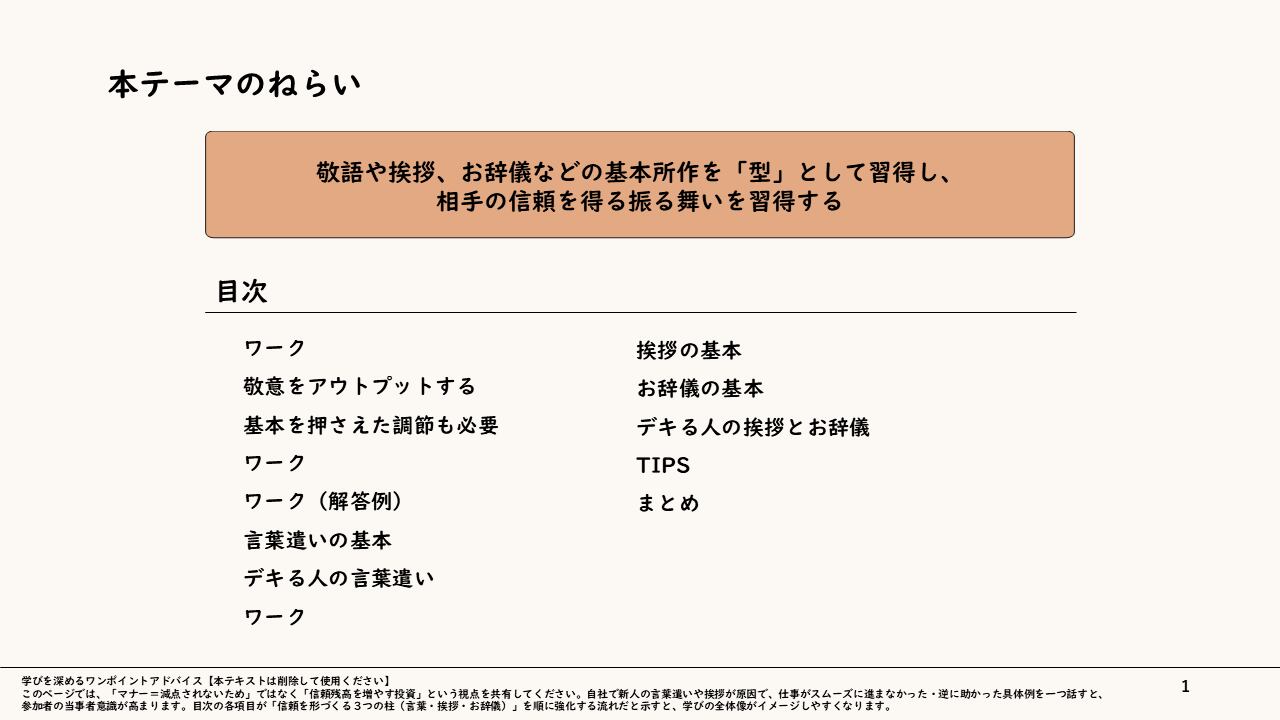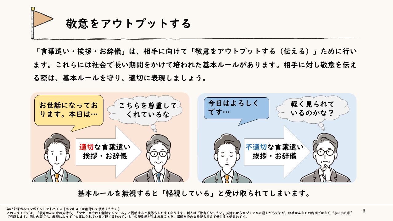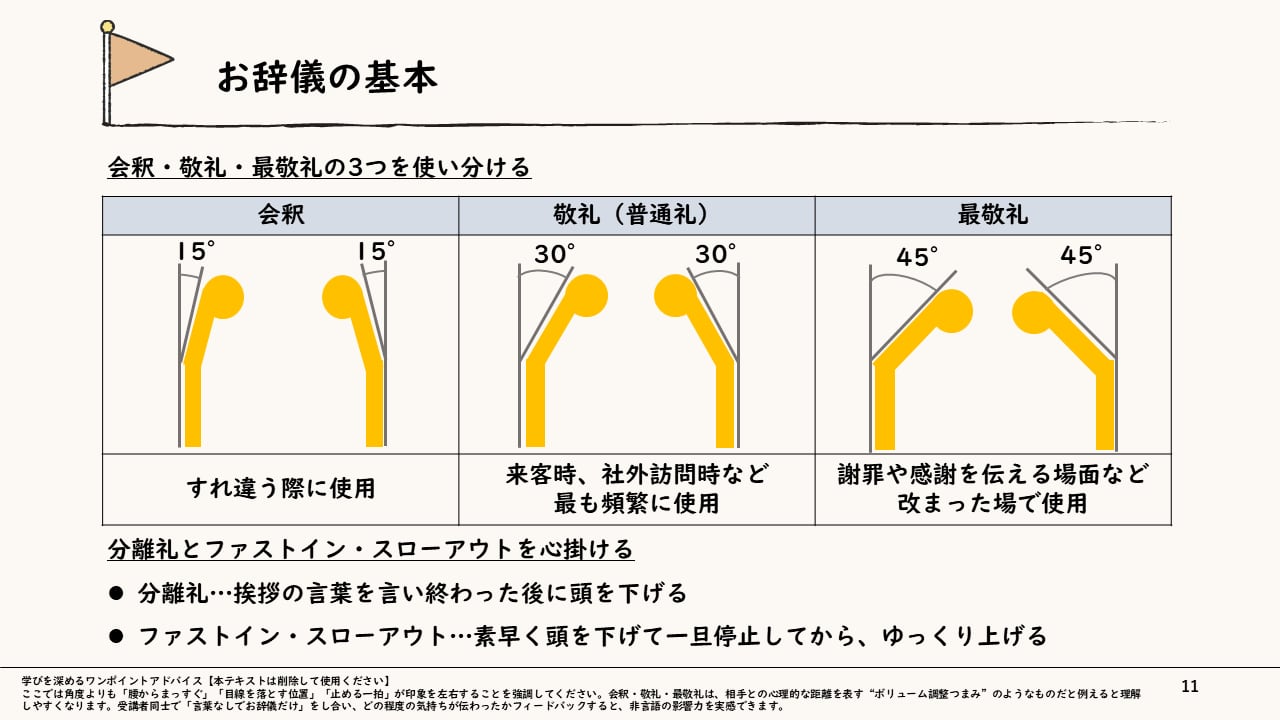 本スライドでは、新入社員が現場で迷わず動けるよう、「言葉遣い」「挨拶」「お辞儀」の実践的な“型”を習得することを目指します。