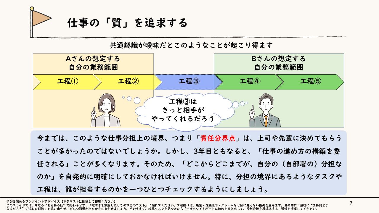 入社からの2年間、仕事の質を高め、適切なコミュニケーションを積み重ねることで、一歩ずつ周囲の信頼を築いてきました。3年目を迎える今、求められるのは、単に「目の前の業務」を完遂するプレイヤーから脱却し、より高い視座で「組織への貢献と自らの介在価値」を捉え直すことです。