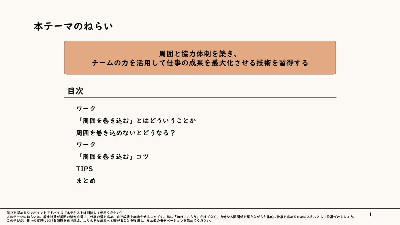 【ねらい】周囲と協力体制を築き、チームの力を活用して仕事の成果を最大化させる技術を習得する。