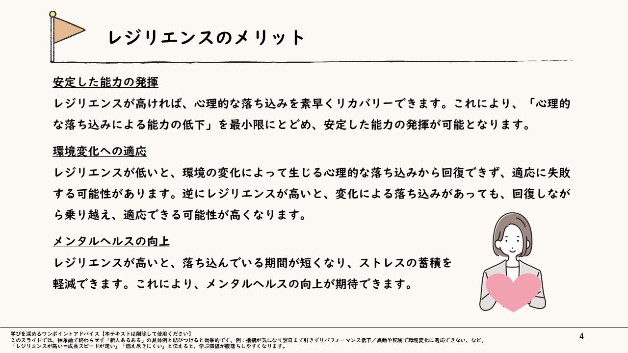 変化の激しい昨今、新入社員にとってビジネススキル同様に身につけて欲しいのが精神面での強さであり、それを表すものがレジリエンスです。