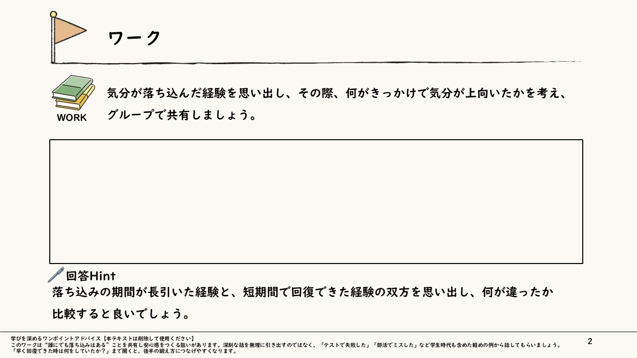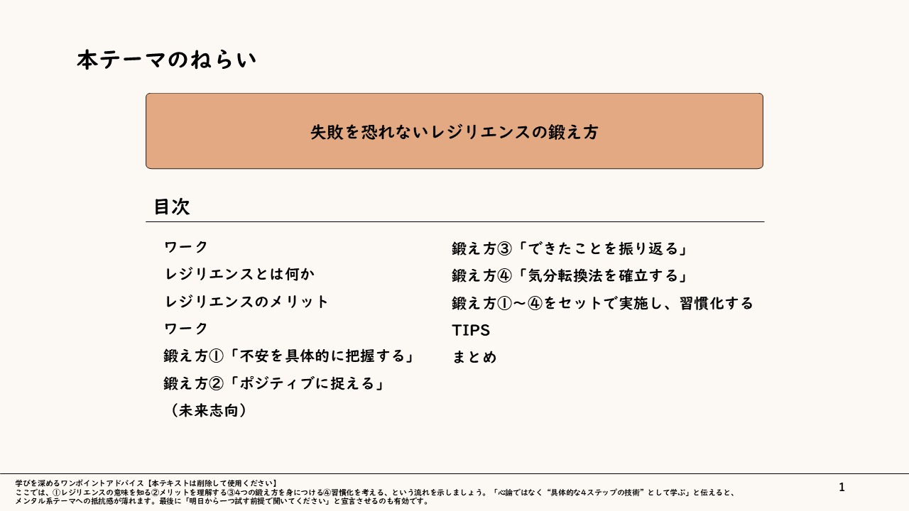 レジリエンスが高いと心理的な落ち込みから素早く回復することができると言われています。本テーマでは、このレジリエンスをどのように鍛えるかに焦点を当て、新入社員が打たれ強くなるためのヒントを紹介します。自分のとった行動やそれによって生じた結果を受け止め、反省・改善をしながら、いかに素早く心理的な立て直しができるかを学習しましょう。
