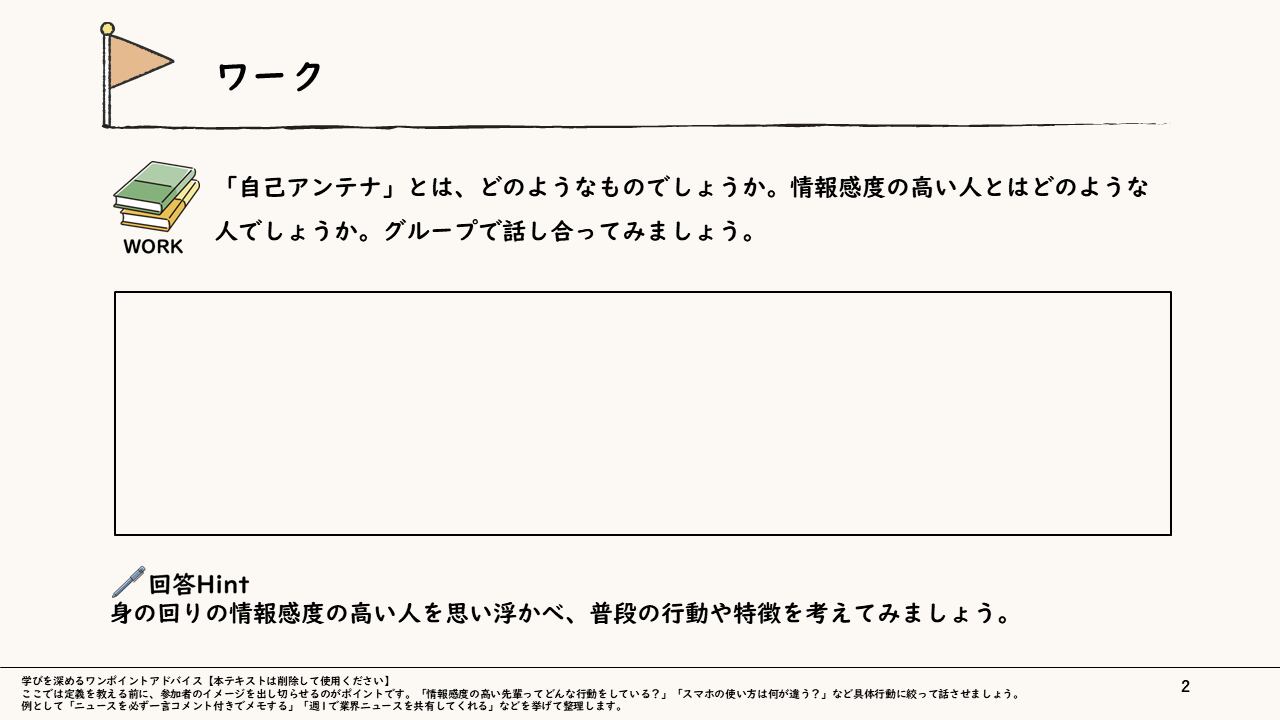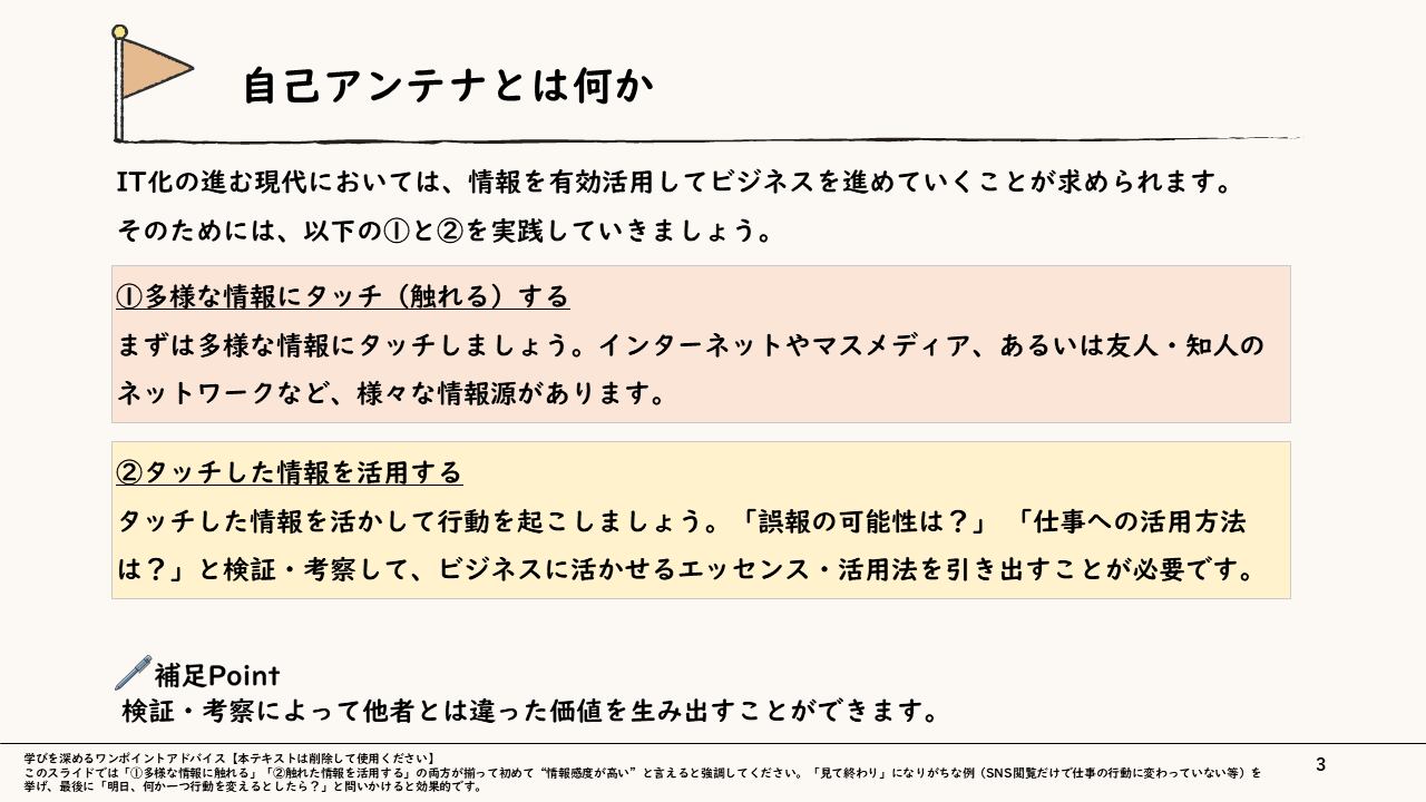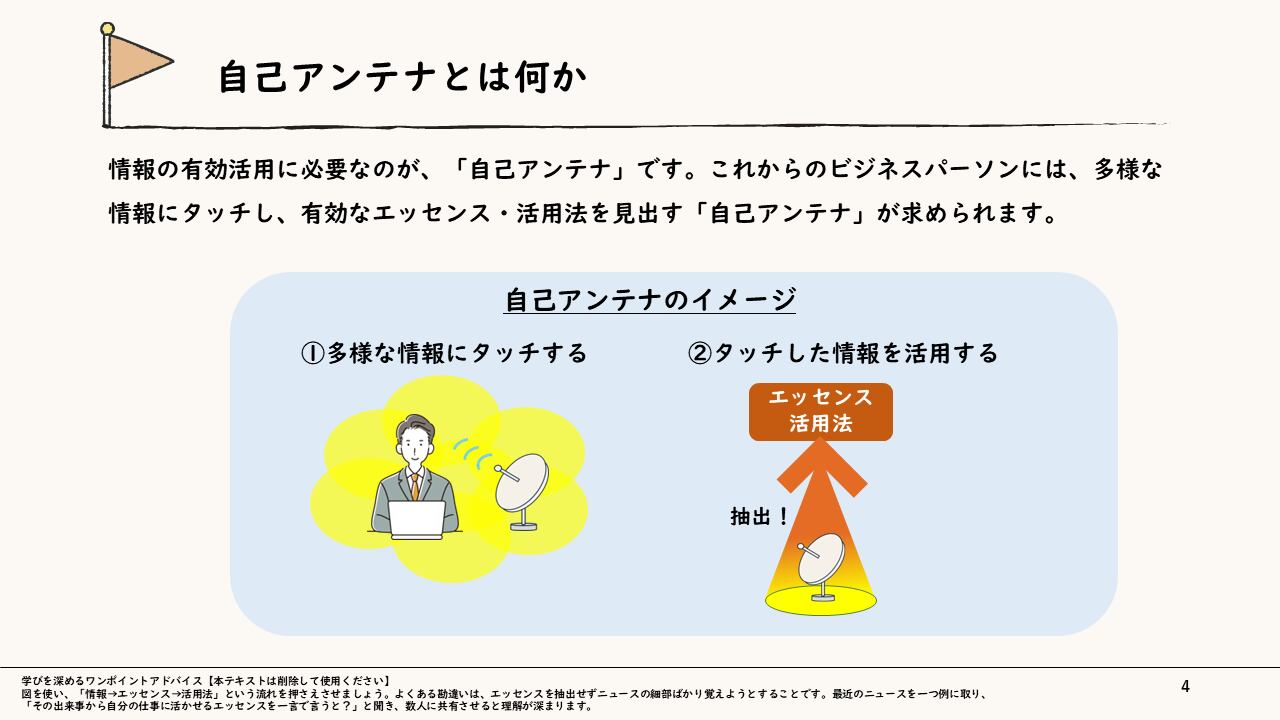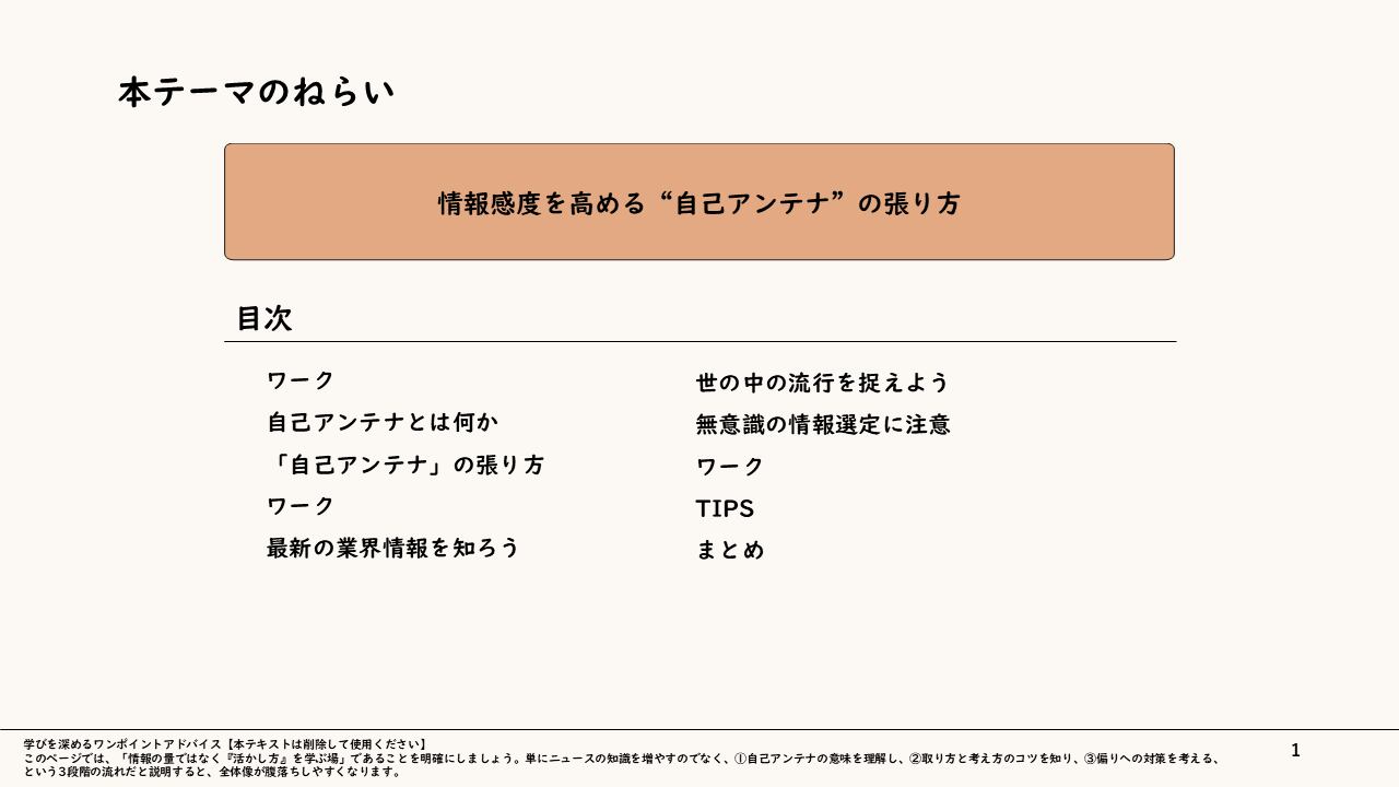 ビジネスを進めるうえで必要不可欠な「情報」ですが、その扱い方によってその有益性は変わってきます。見聞きした情報をそのまま鵜呑みにすることは、情報があふれかえるこの時代においては決して有効とはいえません。そこで、情報の取捨選択や検証・考察が必要になるのです。本テーマでは、こういった情報との向き合い方を主軸に、それを得るための「自己アンテナ」の張り方を学んでいきます。
