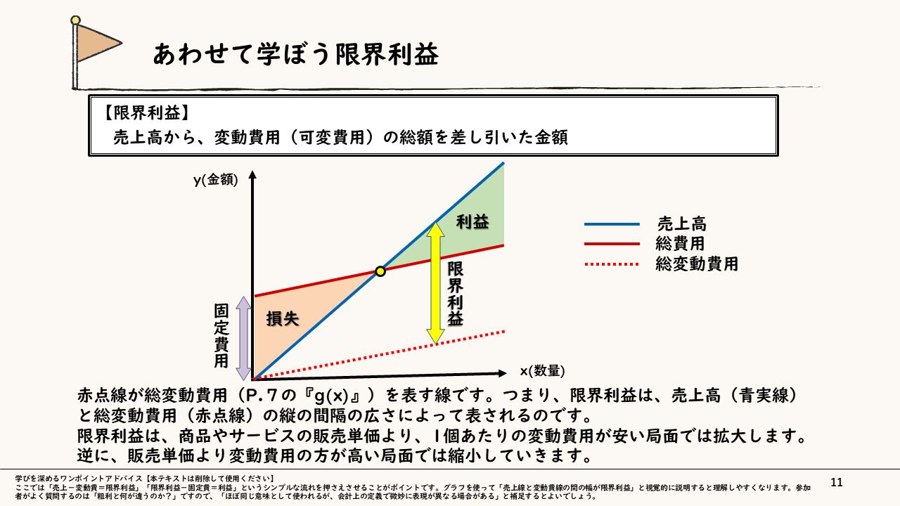 【ねらい】損益分岐点や限界利益の構造を理解し、自律的に収益を改善するアクションを導き出す術を習得する。
