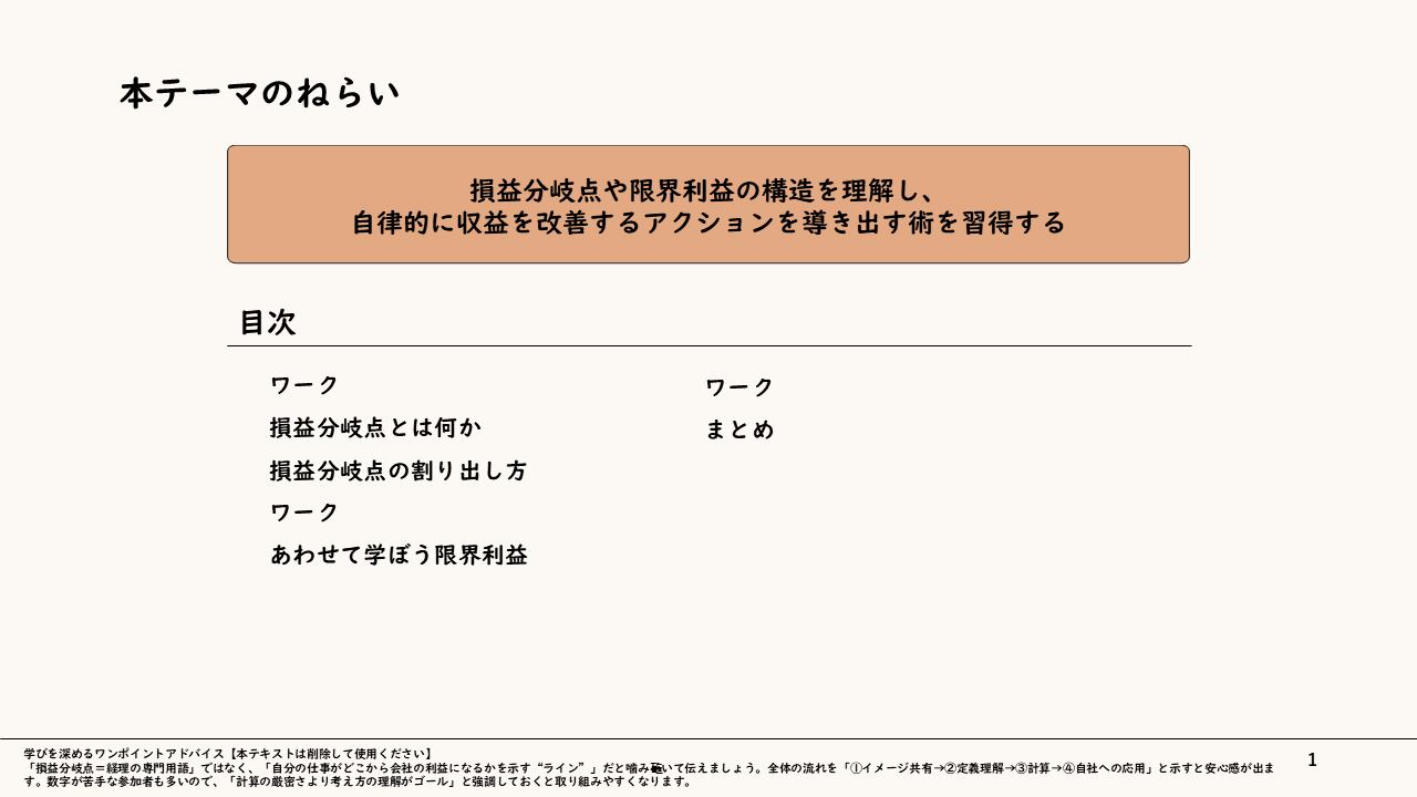 【利益の構造を読み解く】損益分岐点から学ぶ「収益視点」獲得研修スライド 〜自社の数字を理解し、成果への貢献度を高める〜