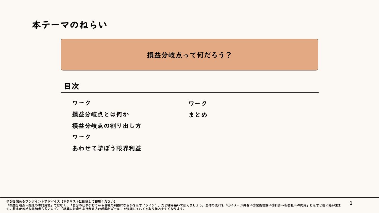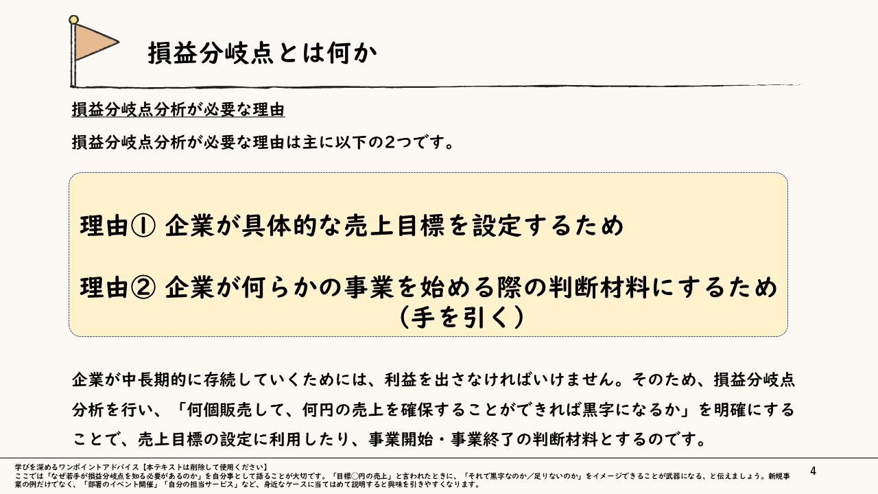 単に「物を売る」「支出を抑える」という行為だけでなく、利益創出の仕組みそのものの理解をしなければ、このような貢献をすることはできません。まずは、販売数量、単価、変動費、固定費の関係性や、限界利益の意味を知ることから始めましょう。そして、学んだことをそのまま自社に当てはめてみましょう。