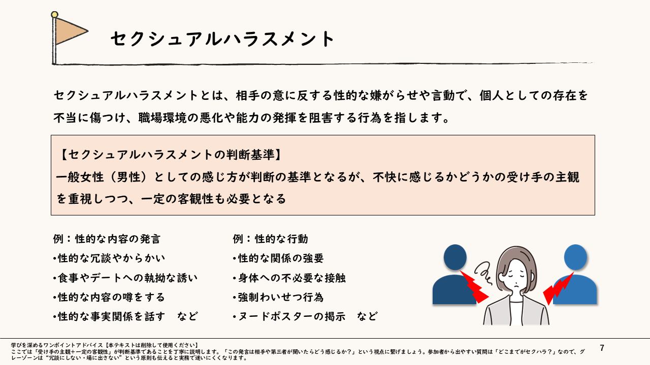 特に指導的な立場にある方は、たとえ悪意がなくても、職場での「優位性」によって無意識のうちにハラスメントの加害者になってしまう恐れがあります。そこで重要になるのが、「何がハラスメントに当たるのか」という正しい知識と、時代に合わせた指導のアップデートです。