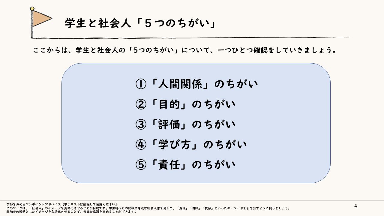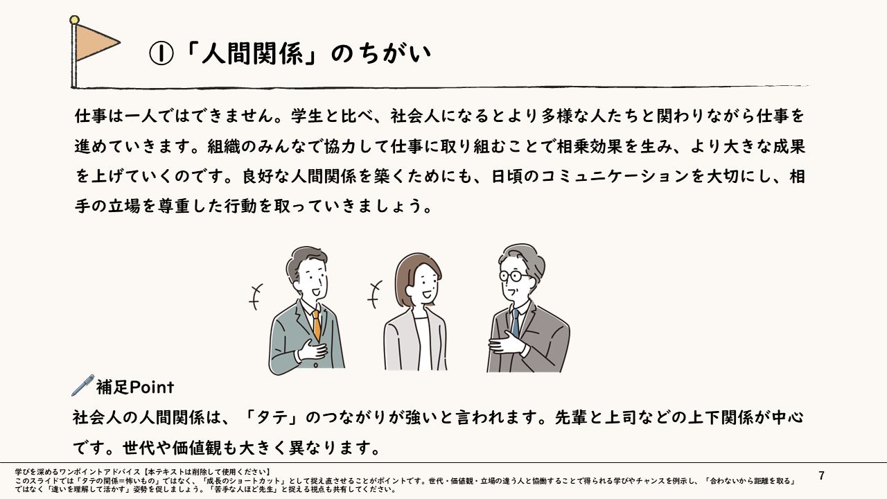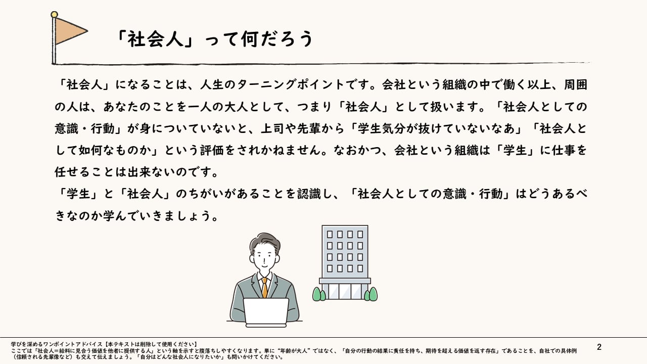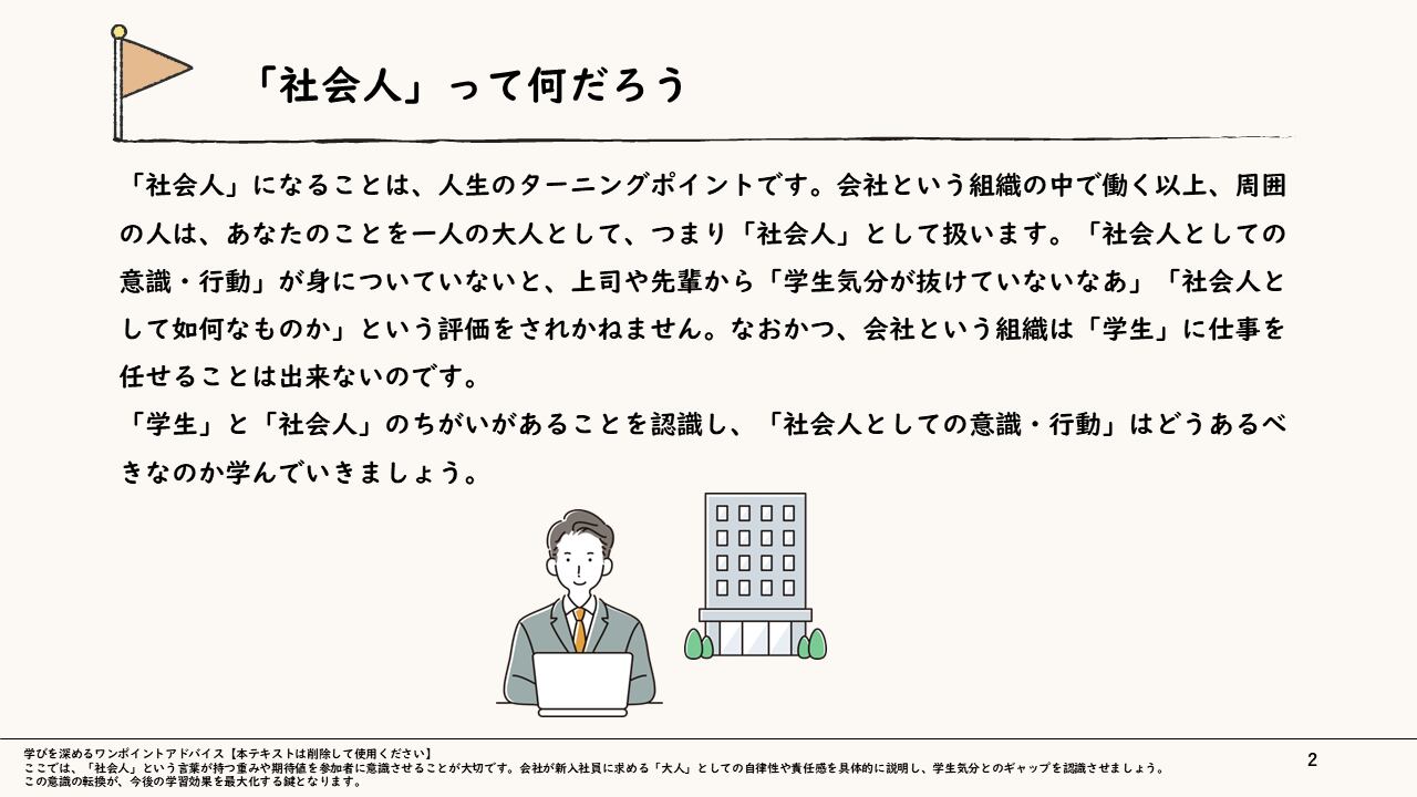 【ねらい】学生と社会人の決定的な違いを理解し、プロフェッショナルとしての行動規範と自律的なマインドセットを習得する。