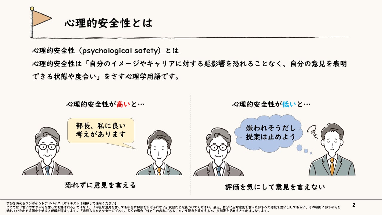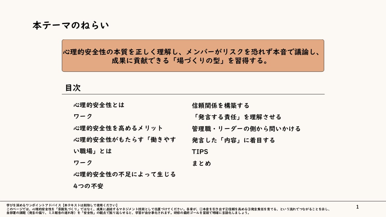【ねらい】心理的安全性の本質を正しく理解し、メンバーがリスクを恐れず本音で議論し、成果に貢献できる「場づくりの型」を習得する。