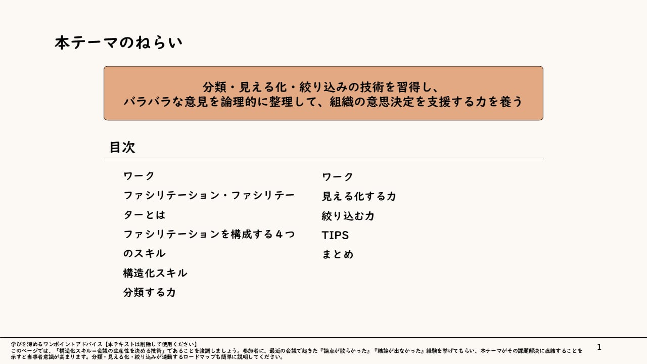 【論点を整理し、意思決定へつなぐ】ファシリテーター養成「構造化スキル」研修スライド 〜分類・見える化・絞り込みで議論を前に進める〜