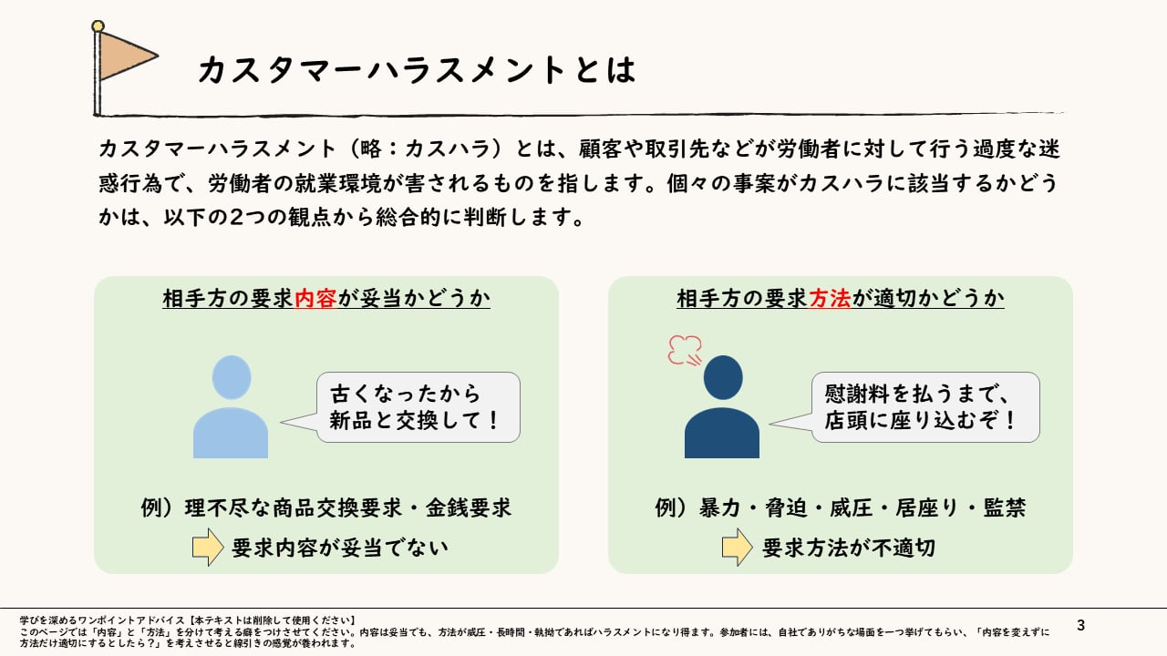カスタマーハラスメント(カスハラ)は、顧客や取引先による過度な迷惑行為によって、労働者の就業環境を害する行為を指します。本スライドは、「どこからがカスハラか」「単なるクレームと何が違うか」を、要求内容の妥当性と要求方法の適切さという2つの観点から整理し、代表的な事例を通じて理解を深める構成になっています。