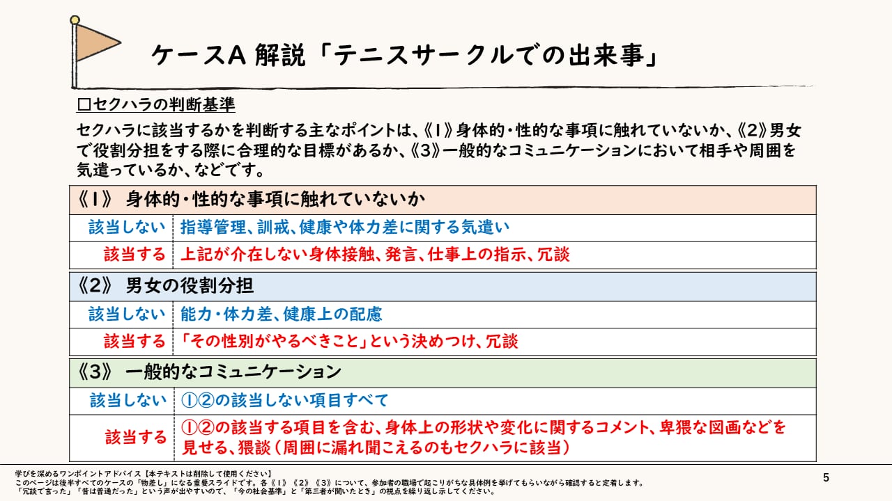 ケースA「テニスサークルでの出来事」では、プライベートなサークルを舞台に、それぞれの行動が「セクハラに該当しない場合/該当する場合」を比較し、《身体的・性的な事項に触れていないか》《男女の役割分担》《一般的なコミュニケーション》という判断基準で整理します。「プライベートだから」「仲間内だから大丈夫」といった感覚的な線引きを見直し、「どのような場面でもセクハラになりうる」という前提で考える視点を養います。
