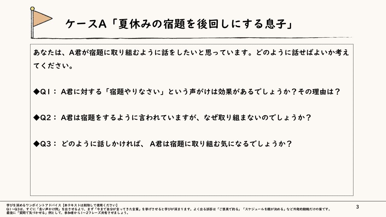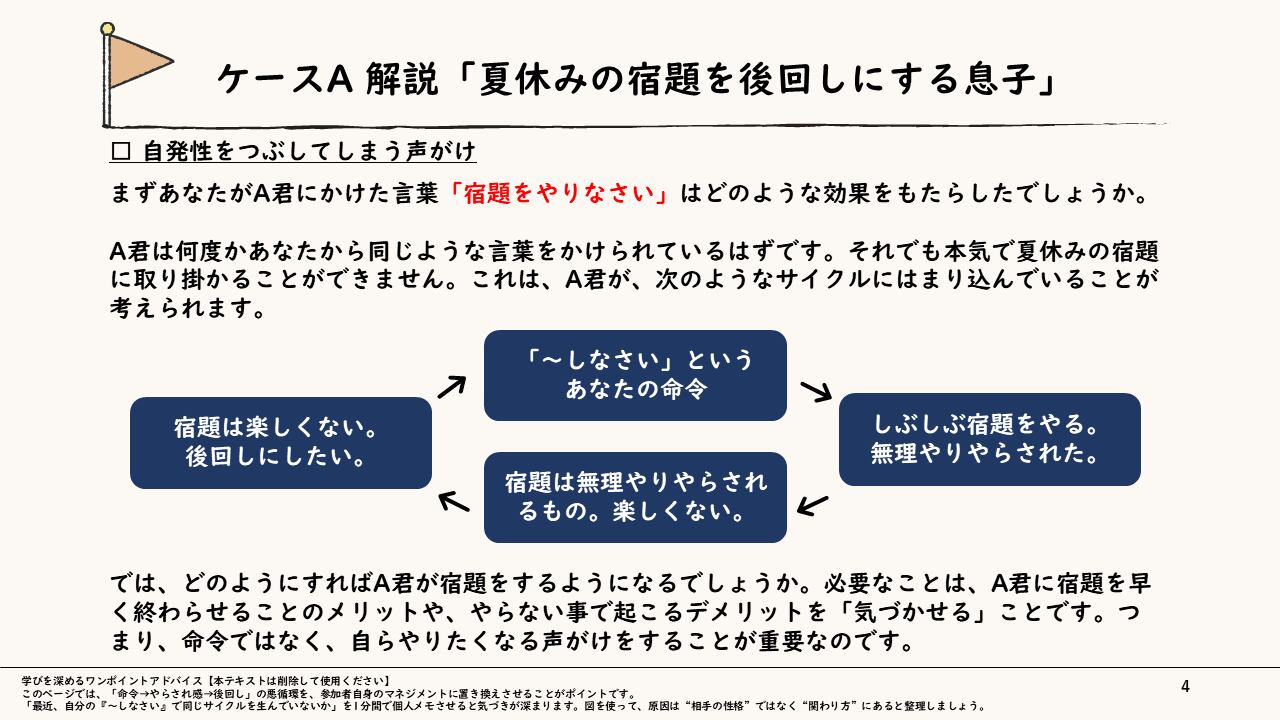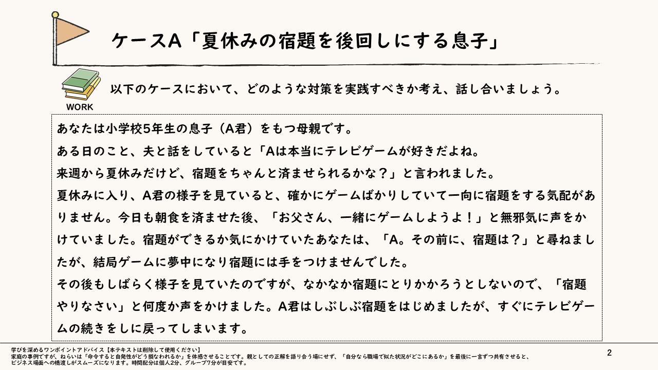 「もっと主体的に動いてほしい」という願いとは裏腹に、つい「答え」や「指示」を押し付けて部下の思考を止めていないでしょうか。本スライドは、身近な「夏休みの宿題」と実務の「研修企画」という2つのケースを通じ、命令が生む悪循環と、自発性を引き出す「内発的気づき」のメカニズムを深く学ぶケーススタディ型教材です。