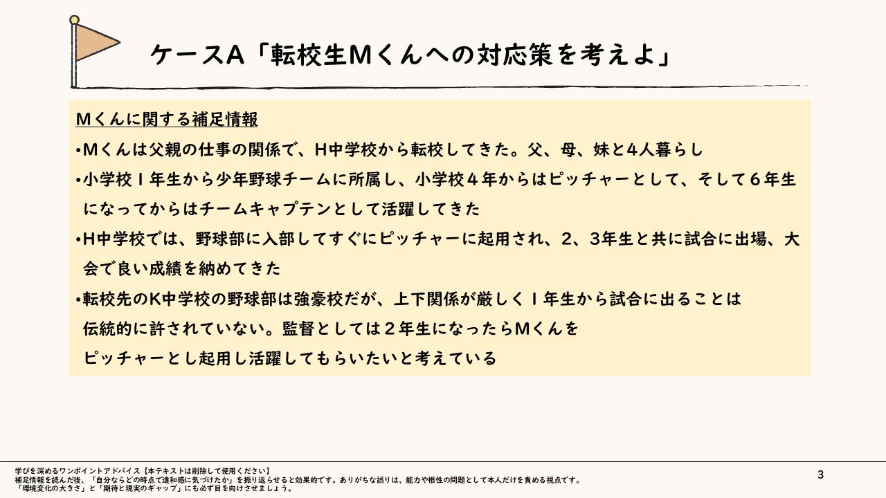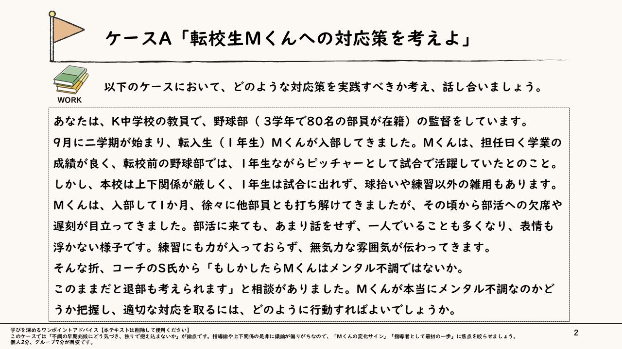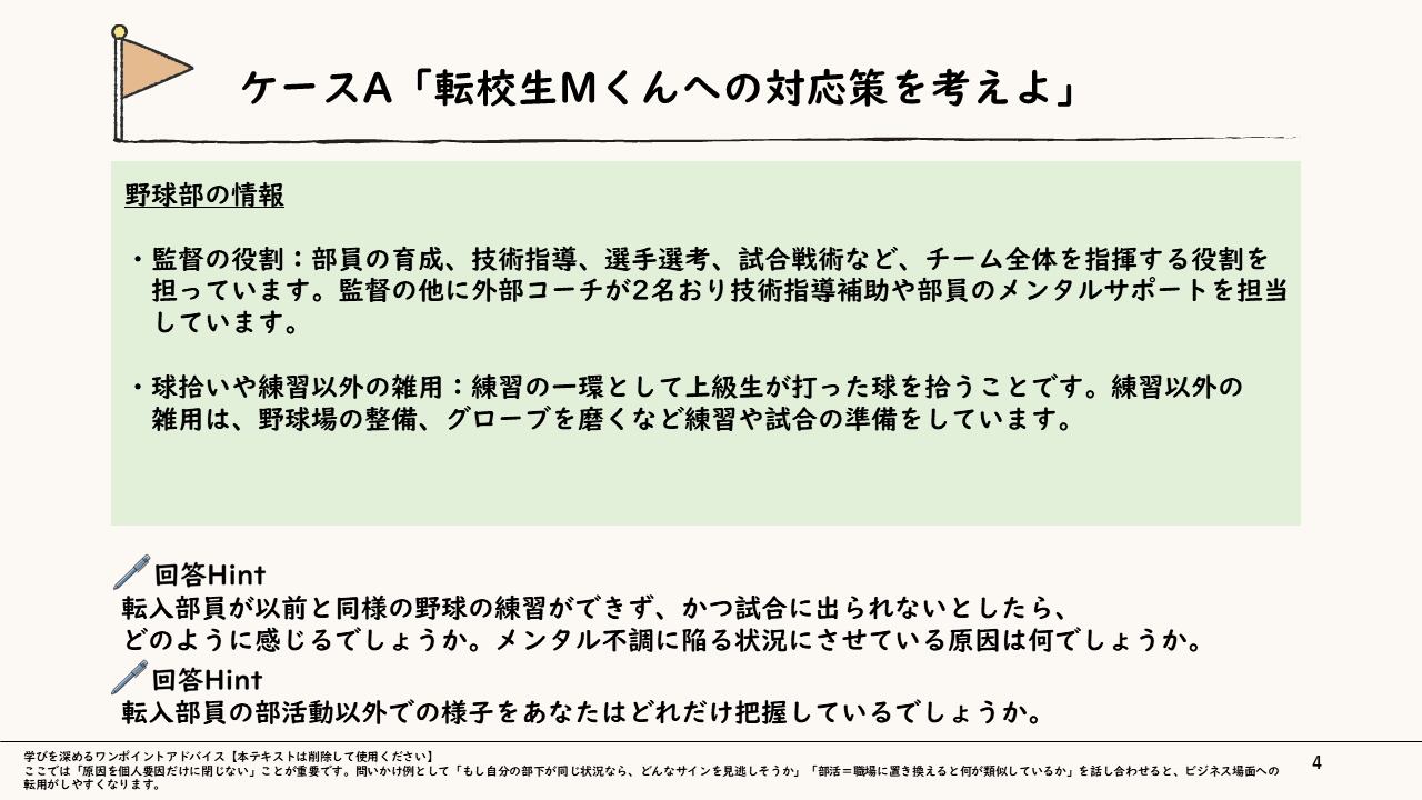 本スライドは、管理職が部下のメンタル不調にどのように気づき、どのような初動を取るべきかを具体的なケーススタディを通じて学ぶ構成になっています。学校の野球部を舞台にしたケースAと、メーカーの品質管理部門を舞台にしたケースBという異なる環境の事例を用い、「不調の早期兆候にどう気づき、独りで抱え込まないか」を実践的に検討します。