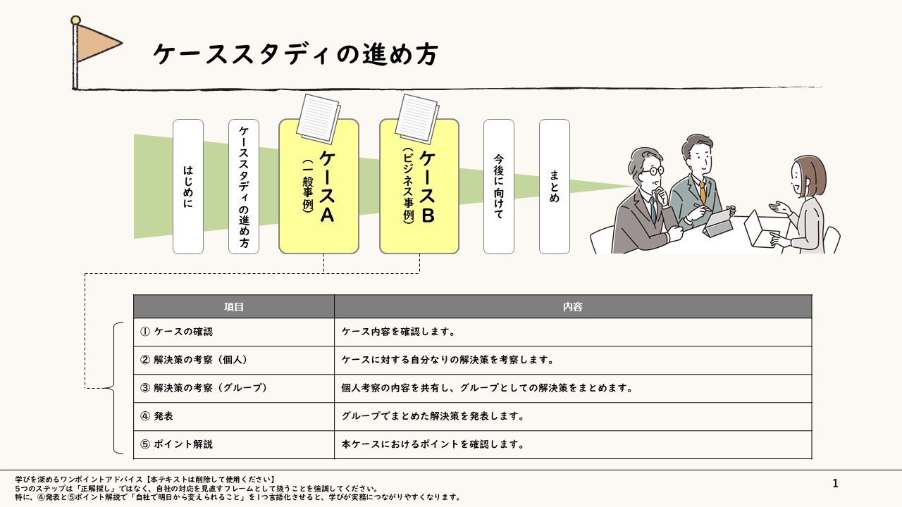・ケーススタディと4ステップの枠組みを使い、自社の対応フローをその場で言語化させたい研修講師の方