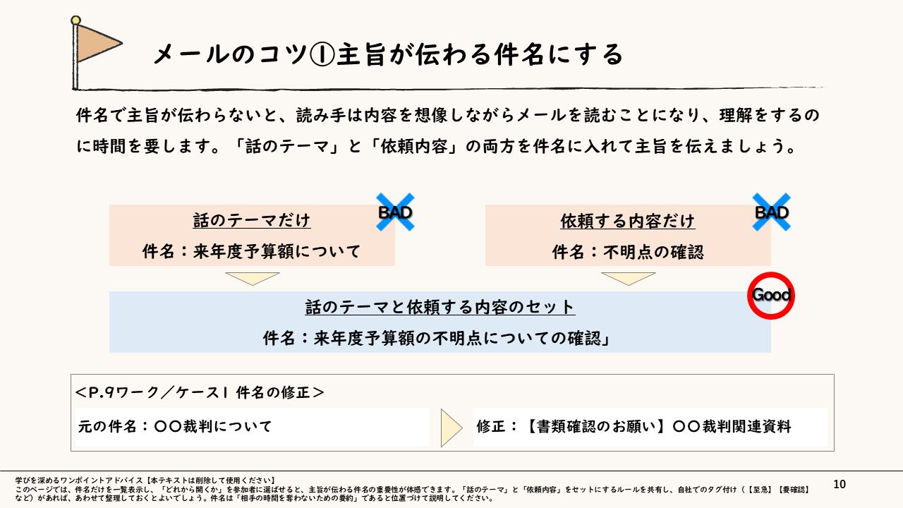 続いて、両方に共通するコツとして「結論から書く」「箇条書きを積極的に活用する」「主語や依頼相手を明確にする」を取り上げ、GOOD/BAD例やケーススタディを用いながら、読み手の理解コストを下げる文章構造を具体的に解説します。メールについては「主旨が伝わる件名」「読み手が必要な情報の整理」「内容と順番の組み立て方」を、チャットについては「議題や前提情報のまとめ方」「リプライ機能の活用」「チャットルームの使い分け」など、場面ごとのポイントを解説しています。