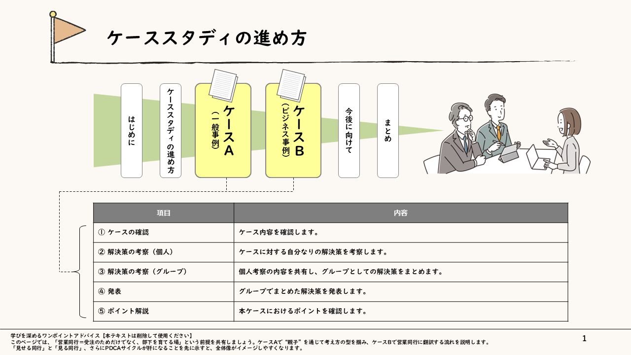 管理職にとっての営業同行は、単なる「受注のための付き添い」ではありません。本スライドは、同行を「部下の成長を加速させるOJTの場」として再定義し、その具体的な進め方をケーススタディ形式で学ぶ教材です。「目的を明確にし、目的に合った関わり方を選ぶ」という育成の基本原則を、身近な事例とビジネス事例の比較から紐解きます。