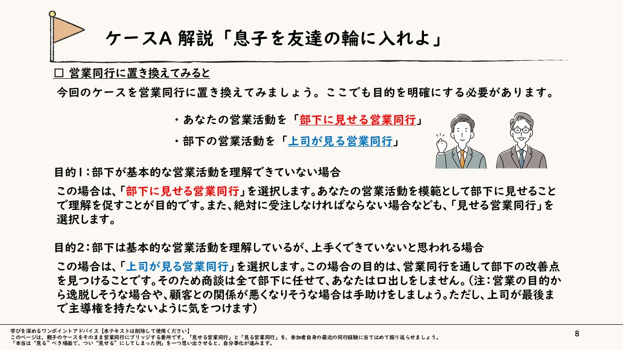 【ねらい】営業同行の場で育成視点を持ち、部下の自律と成果を高める関わり方を習得する。