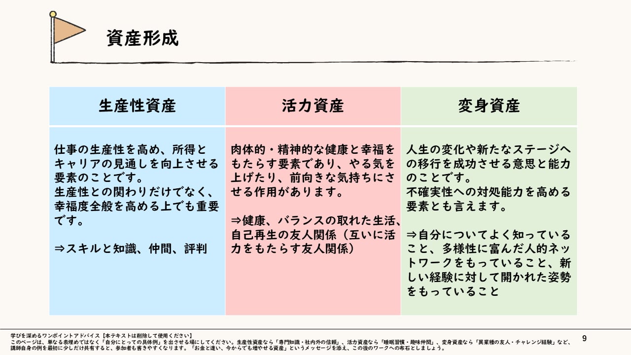 従来の「教育→仕事→引退」の3ステージ型人生と、教育・エクスプローラー・インディペンデント・プロデューサー・ポートフォリオ・ワーカーを行き来するマルチステージ型人生を対比しながら、長寿社会で求められる新しい人生設計のイメージを描きます。また、有形資産だけでなく、生産性資産・活力資産・変身資産といった無形資産の重要性を整理し、自身の現在地をセルフチェックするワークも用意しています。