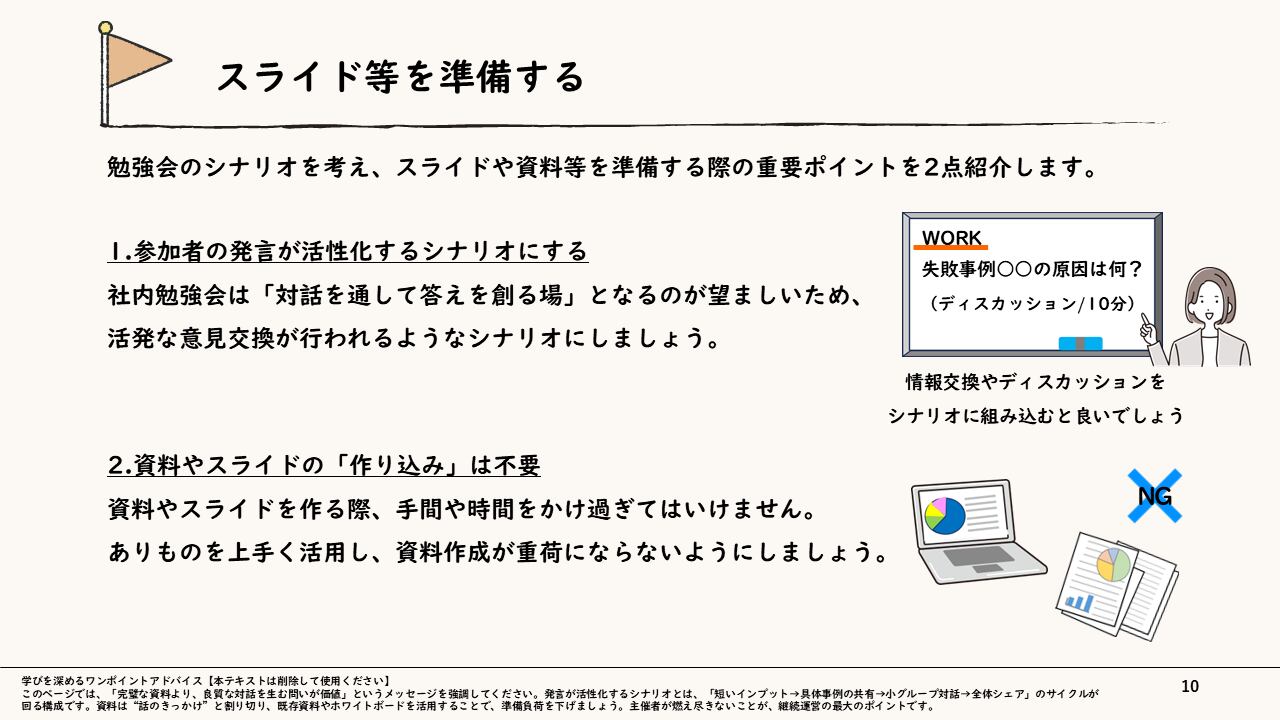 【ねらい】社内勉強会の設計・運営フローを習得し、社員が主体的に知識を交換し合う「学習文化」を構築する。
