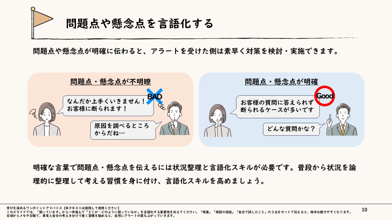 【ねらい】早めにリスクを共有して事態を防ぎ、組織の損失を減らすアラート術を習得する。