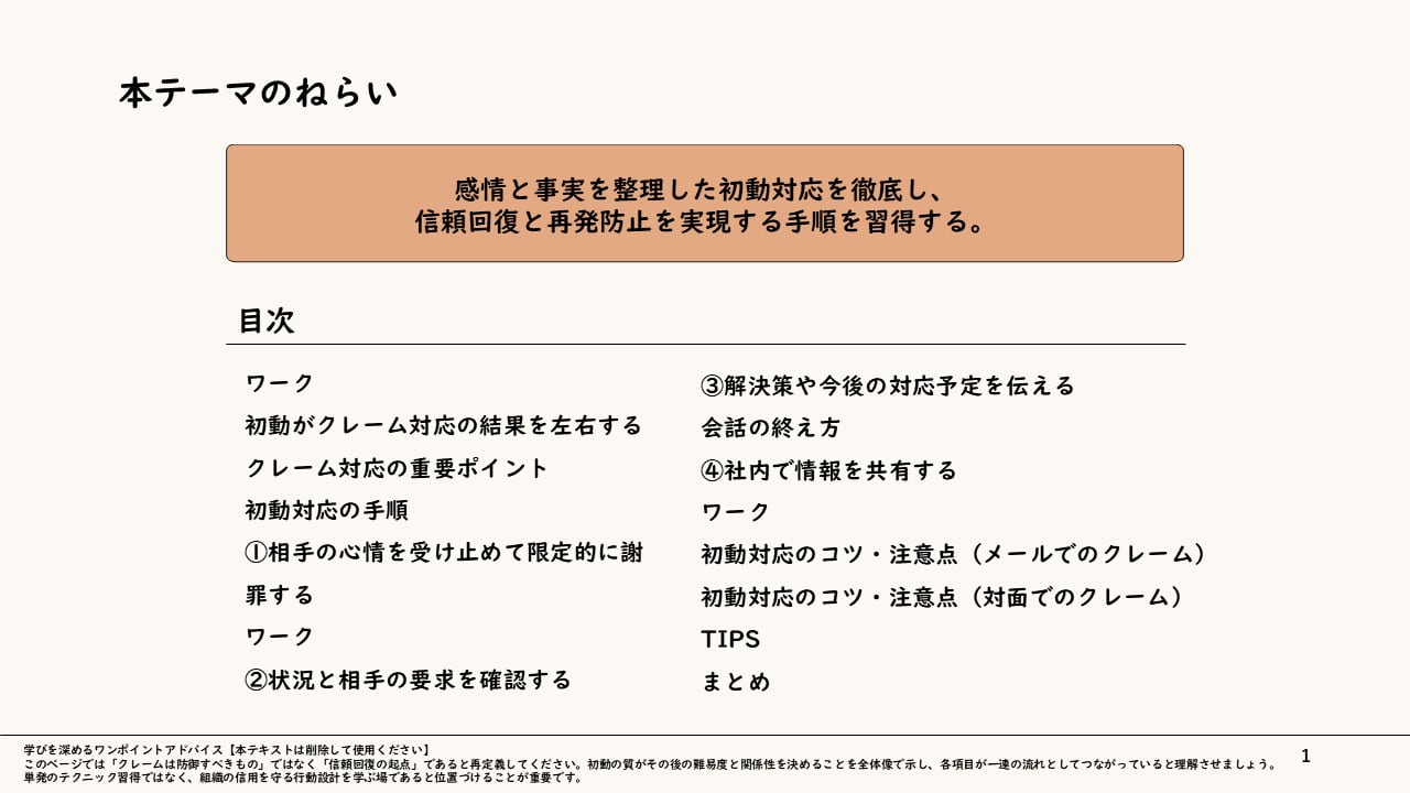 【ねらい】感情と事実を整理した初動対応を徹底し、信頼回復と再発防止を実現する手順を習得する。
