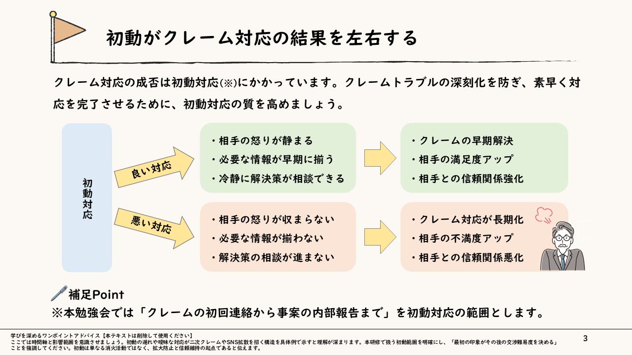 本スライドは、クレームを「防御すべきトラブル」ではなく「信頼回復の起点」と捉え直し、初動対応の質で結果が大きく変わることを体系的に学ぶ構成です。「クレームの初回連絡から事案の内部報告まで」を初動対応と定義し、その範囲で何をどこまで行うべきかを明確にします。