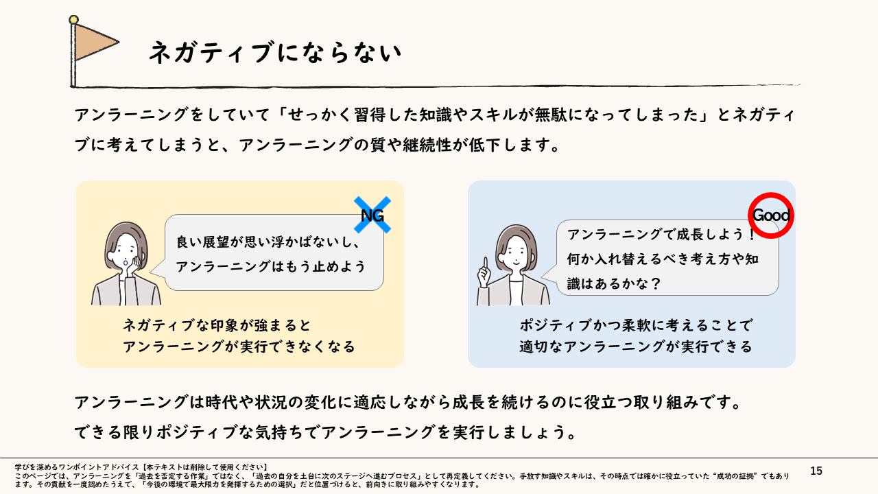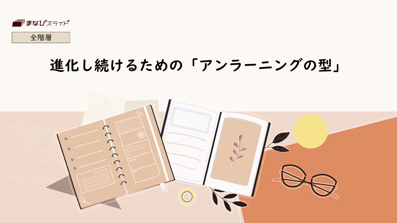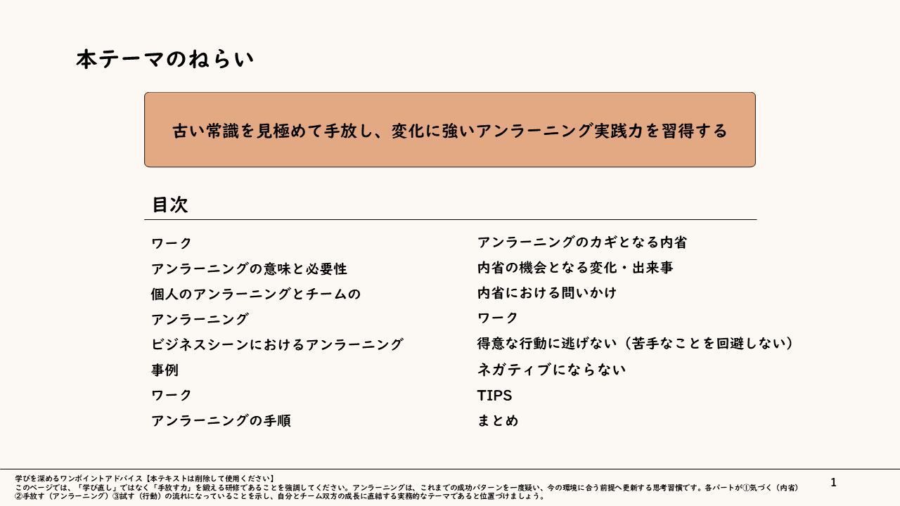 本スライドは、時代や状況に合わなくなった考え方・価値観・知識等を意識的に手放し、新しい前提へと入れ替える「アンラーニング」の型を体系立てて身につけ、「学び直し」ではなく「手放す力」によって環境変化とともに成長し続ける実務的な思考習慣を獲得することを狙いとしています。