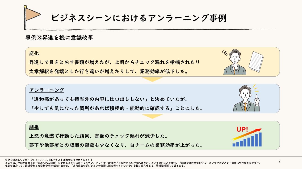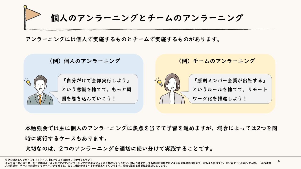 アンラーニングの意味と必要性を押さえたうえで、「個人のアンラーニング」と「チームのアンラーニング」を整理し、営業スタイルやツール選択、昇進後の役割認識といった具体事例を通じて、どちらの前提を見直すべきかを見極めながら、「結果が変わる前に思考の前提を変える」視点を養う内容となっています。